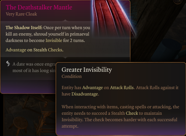 我真的希望这件披风能够很好用,但发现没有公开发布的模组实现这个功能后,我决定自己来做。它非常简单:你获得的是更高级别的隐身效果而不是普通的隐身,并且在潜行检查中具有优势。