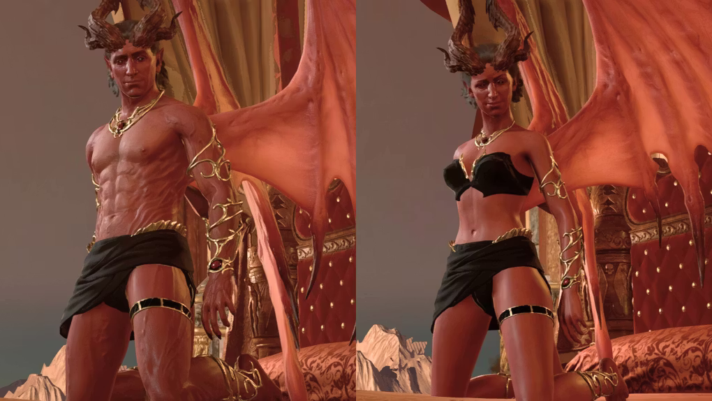 此模组替换了哈尔勒普在两种形态下的服装和短裙,并用金色饰品替换。这些金色饰品在整个场景中都会保留,只有衣物会在场景中间被移除。