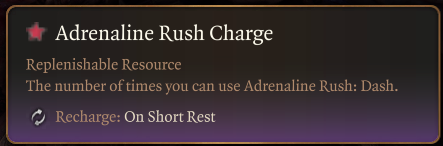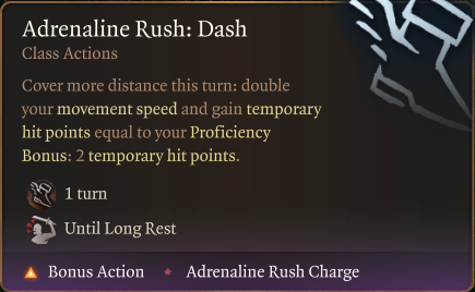 新增了肾上腺素冲刺:你可以使用一次额外动作进行一次冲锋,这将使你的移动速度翻倍,并获得等于你熟练加值的临时生命值。此能力可以使用的次数等于你的熟练加值,在短休或长休后恢复充能。