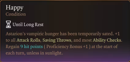 当阿斯塔里安处于快乐状态且不在阳光下时,他每回合将恢复其熟练加值+1点生命值。