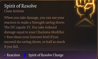 坚定精神:当你受到伤害时,你可以使用你的反应进行一次(力量、敏捷或智力)豁免。豁免的成功DC为15。如果你成功了,则减少的伤害等于魅力调整值加上四倍的术士等级;如果失败则减半。