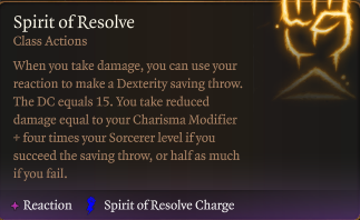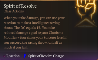坚定精神:当你受到伤害时,你可以使用你的反应进行一次(力量、敏捷或智力)豁免。豁免的成功DC为15。如果你成功了,则减少的伤害等于魅力调整值加上四倍的术士等级;如果失败则减半。