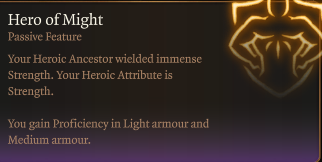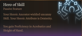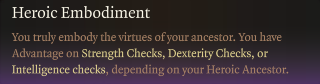 你真正体现了祖先的美德。根据你的英雄先祖,你在力量检定、敏捷检定或智力检定上具有优势。