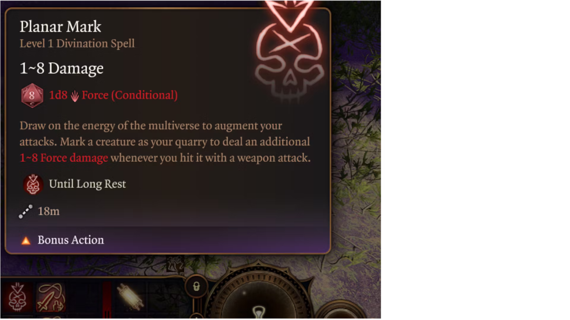 作为一次附赠动作,选择一个你可以在30英尺内看到的生物。在本轮中使用武器攻击命中该生物时,它将额外受到1d8点力场伤害。当你在这个职业达到11级时,这个额外伤害增加到2d8。