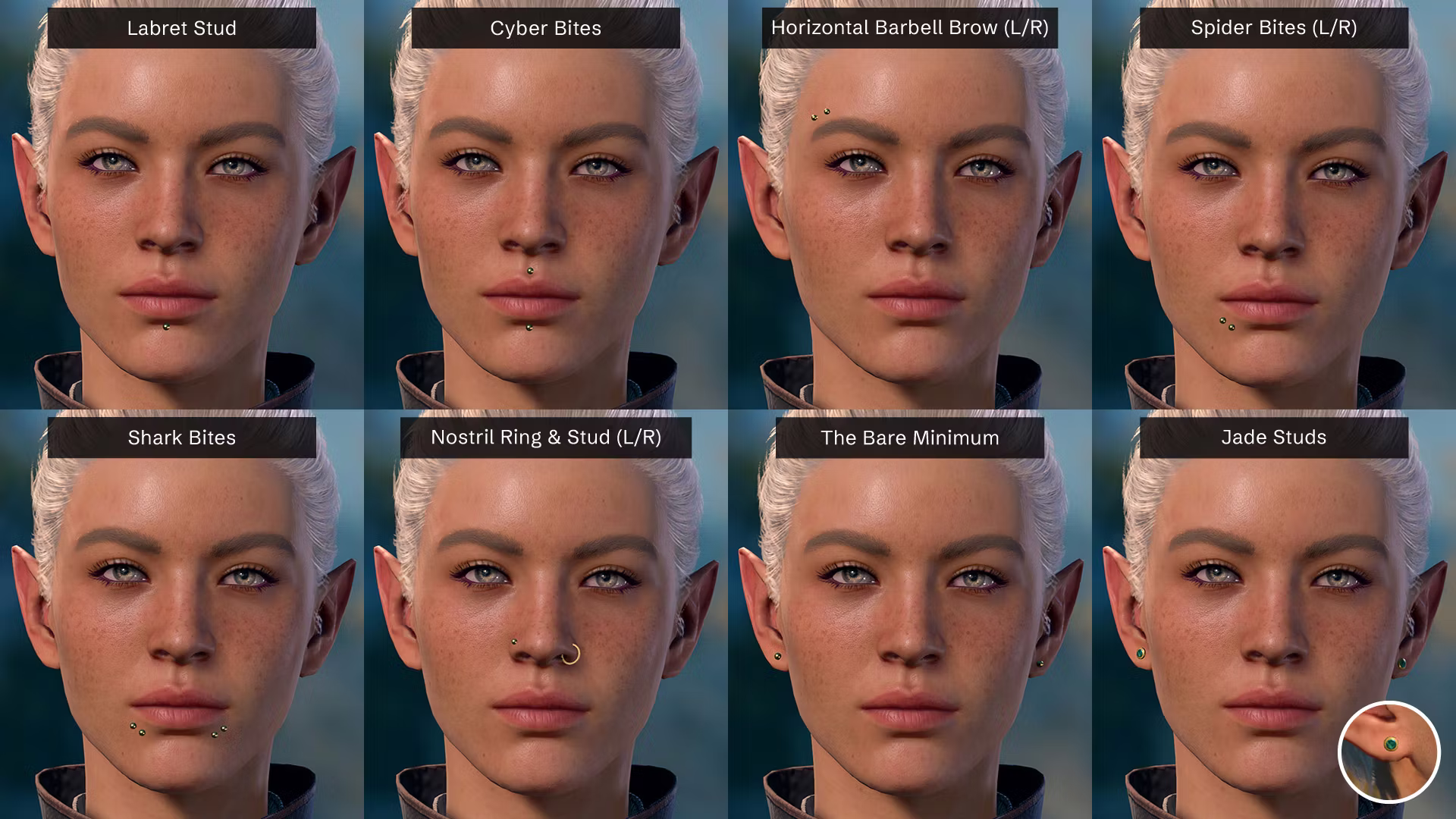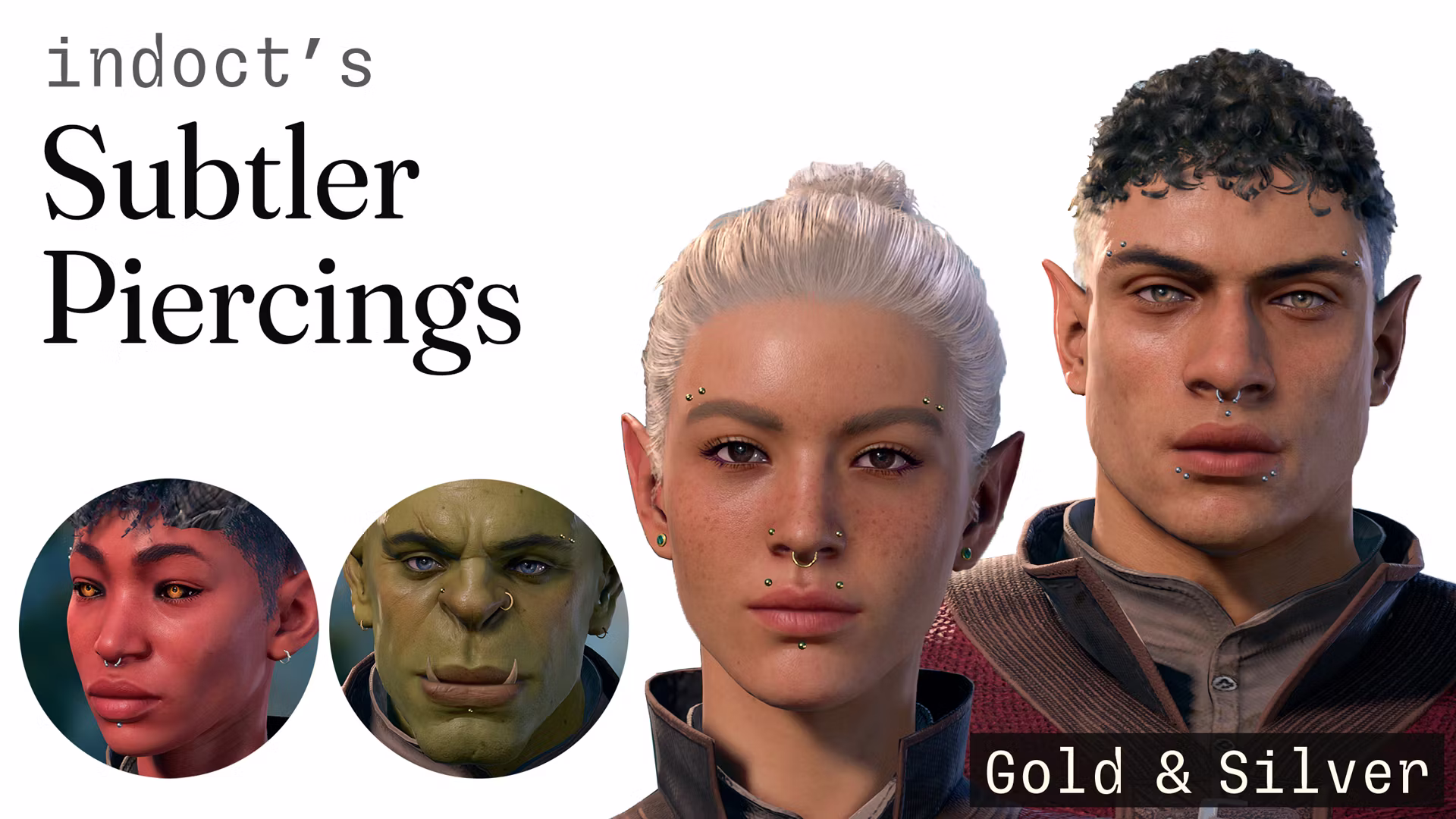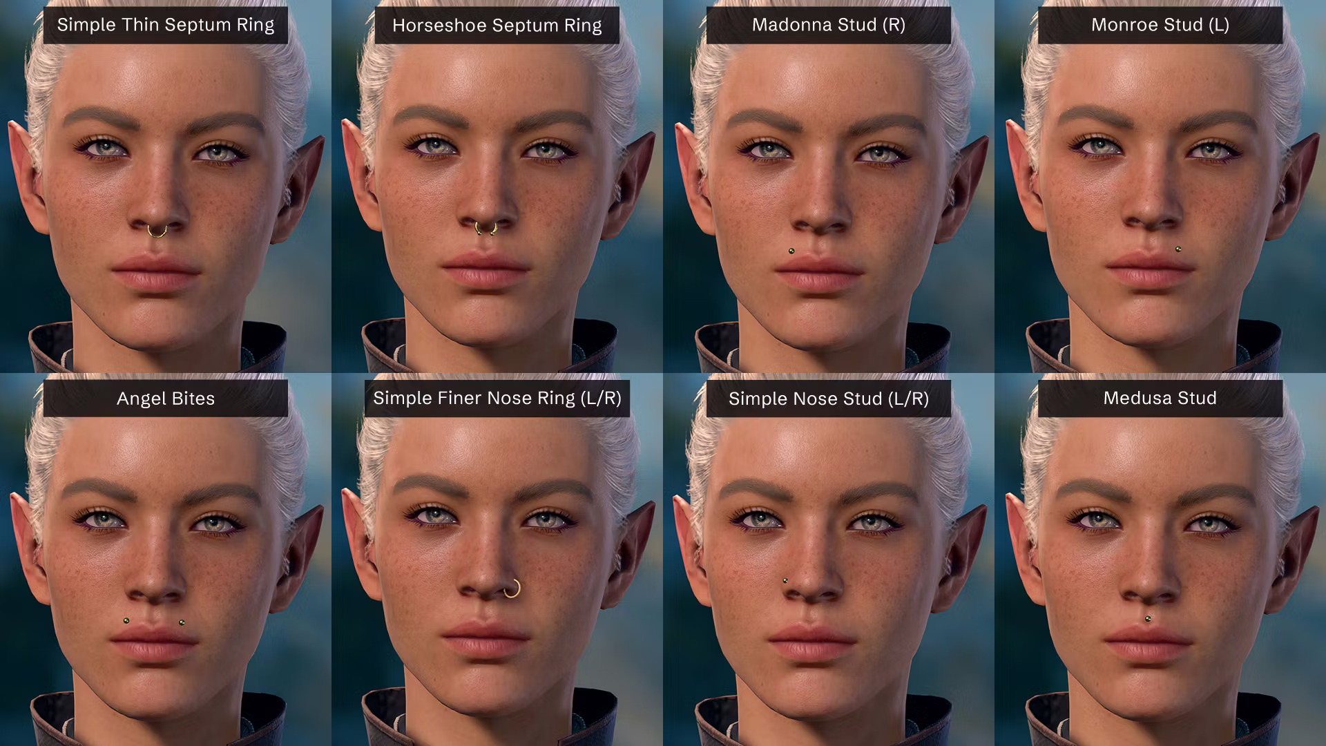 添加了许多定制的、极简主义风格的穿孔和金银材质的套装,以及不同类型的穿孔样式和位置,如水平眉毛杠铃、莫纳克穿孔、麦当娜穿孔等。为您的角色提供更小巧精致的珠宝,以便您可以选择更加简约的外观。