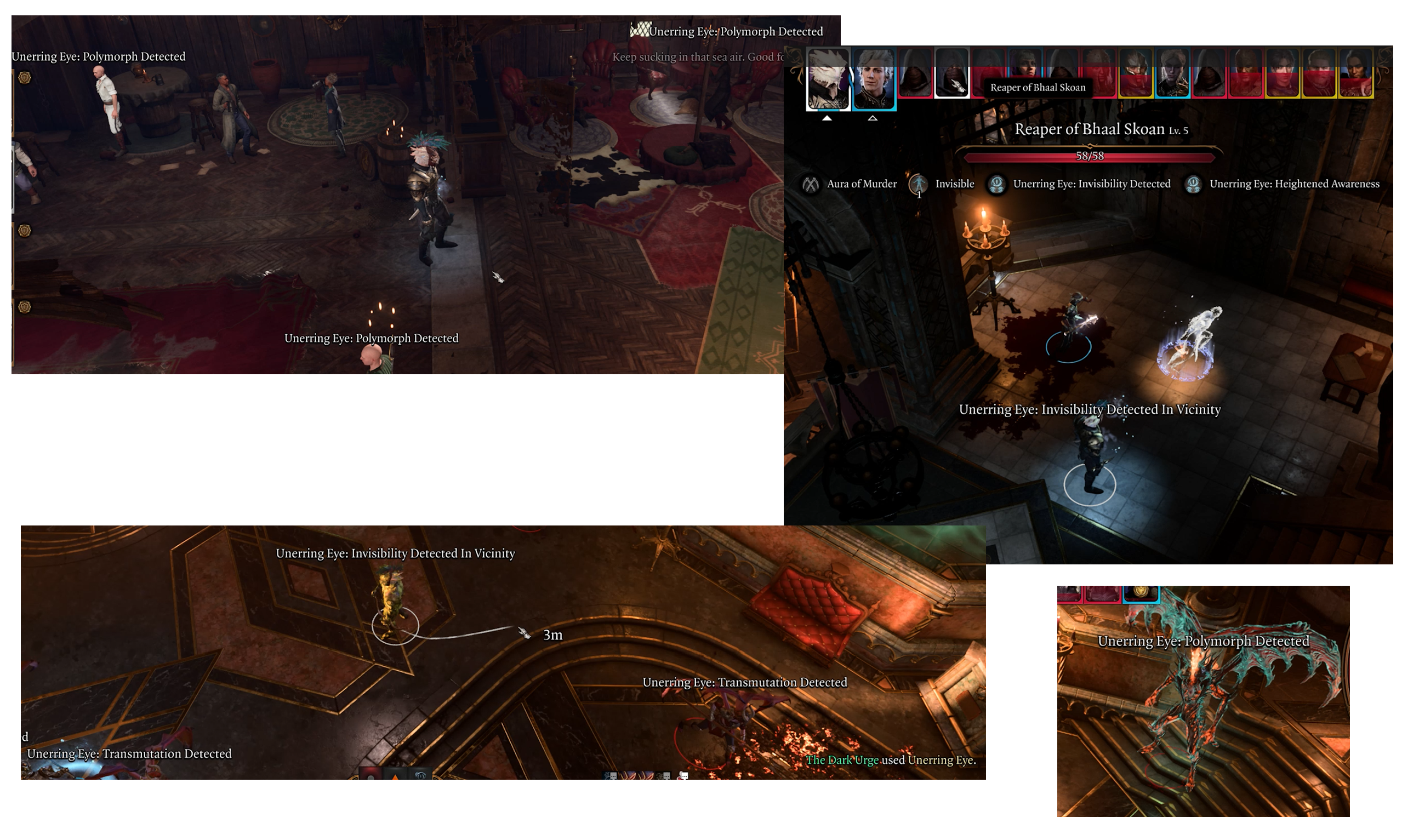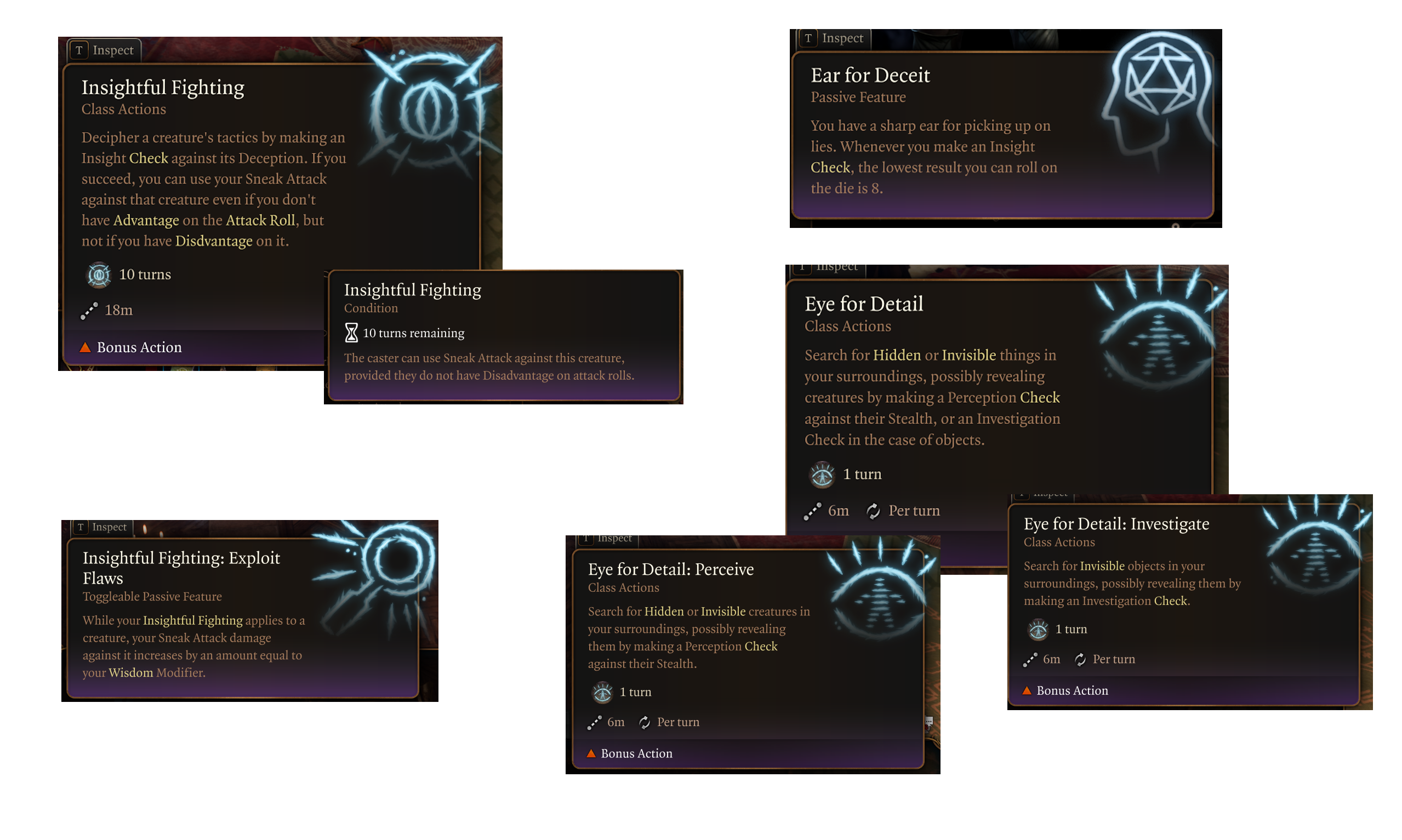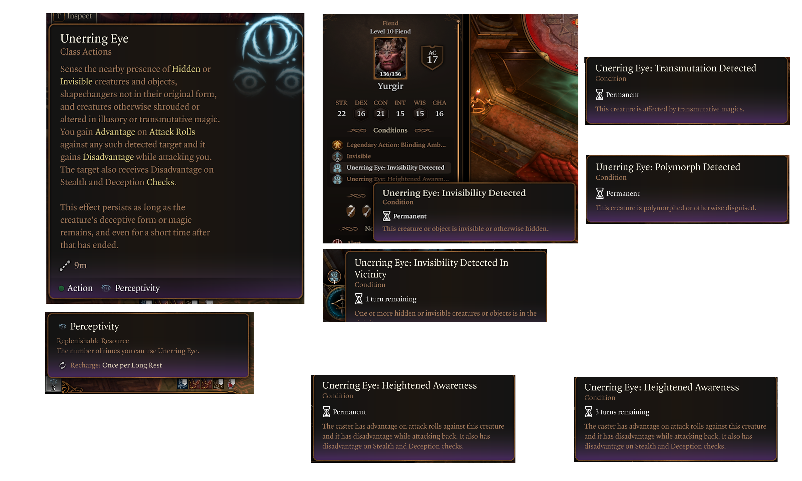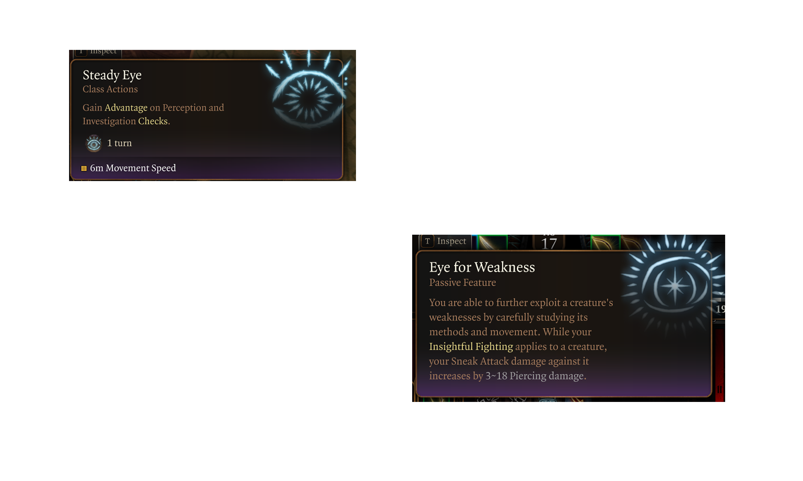 大多数能力都尽可能接近桌面版进行了添加,除了“不屈之眼”(Unerring Eye)这一技能被修改和扩展以适应《博德之门3》的需求。这是一个相当大的项目,并且下面有详细的描述。