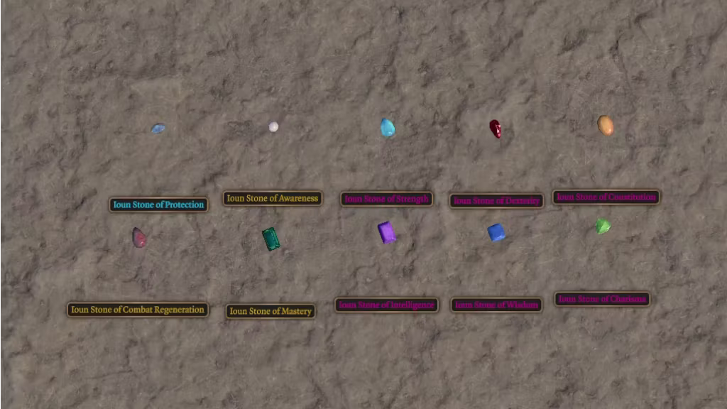 伊欧石是一种大约大理石大小的物品,以知识和预言之神伊欧命名,在某些世界中受到尊敬。存在多种类型的伊欧石,每种类型都有独特的形状和颜色组合。