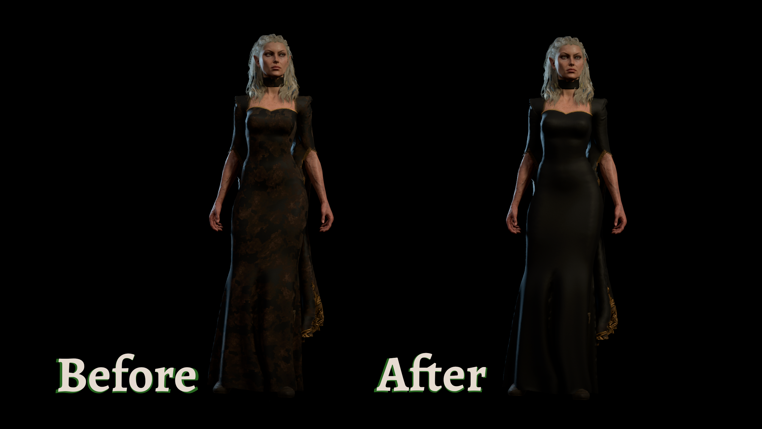 此模组移除了贾海拉 角色视觉资源 中的所有血迹和尘土,仅此而已。当你第一次遇到她时,她仍然会有一点点脏(考虑到当时的环境是可以理解的),你只需要在她加入队伍后给她一些肥皂。