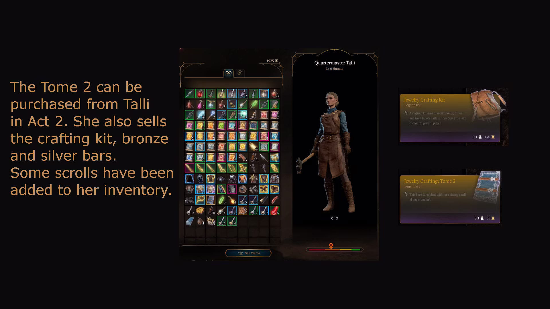 你可以从 Dammon 处购买珠宝制作工具包和《珠宝制作:卷一》书籍来开始你的旅程。随着你在战役中的进展,你会获得其他书籍以学习新的配方。