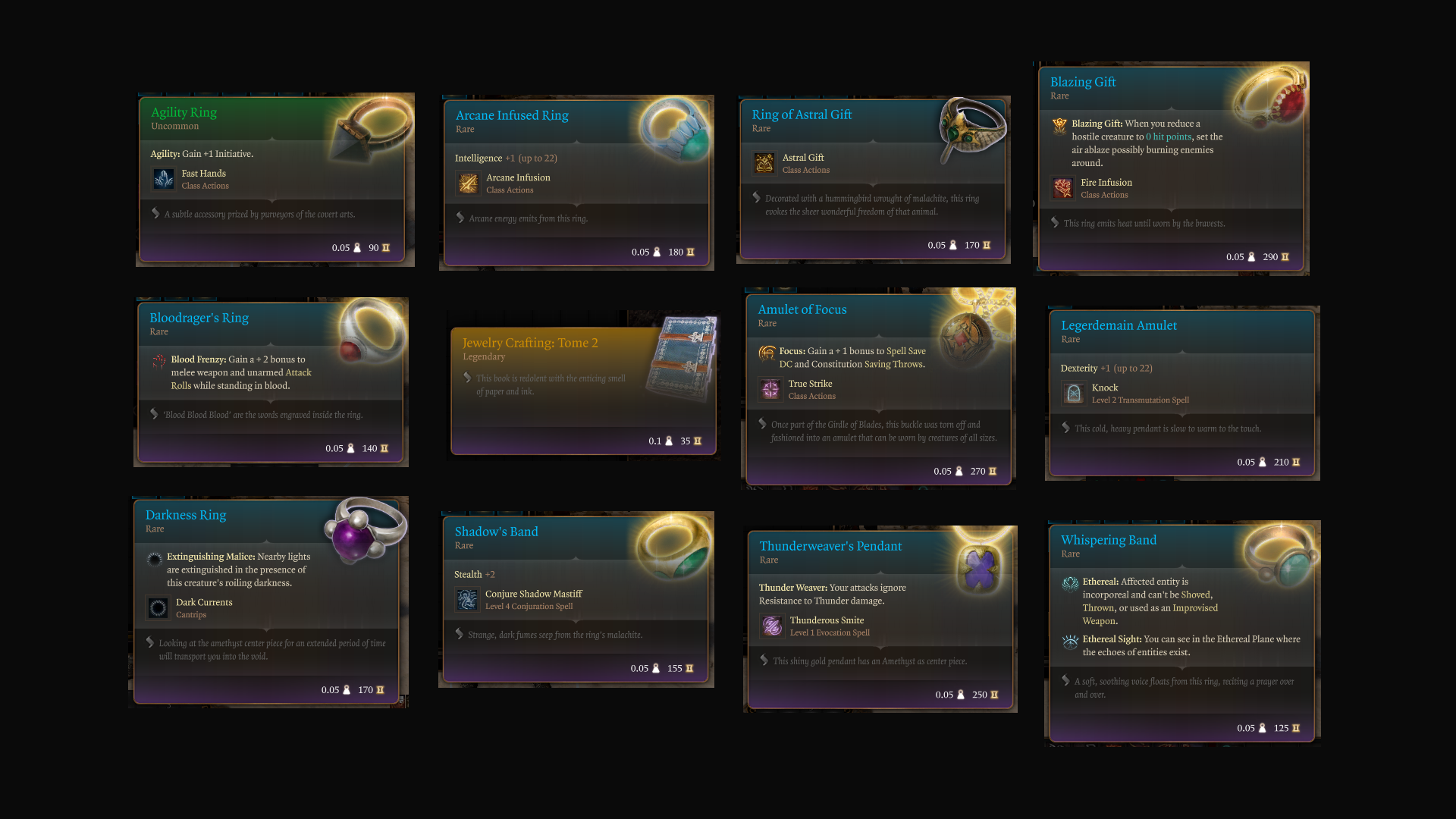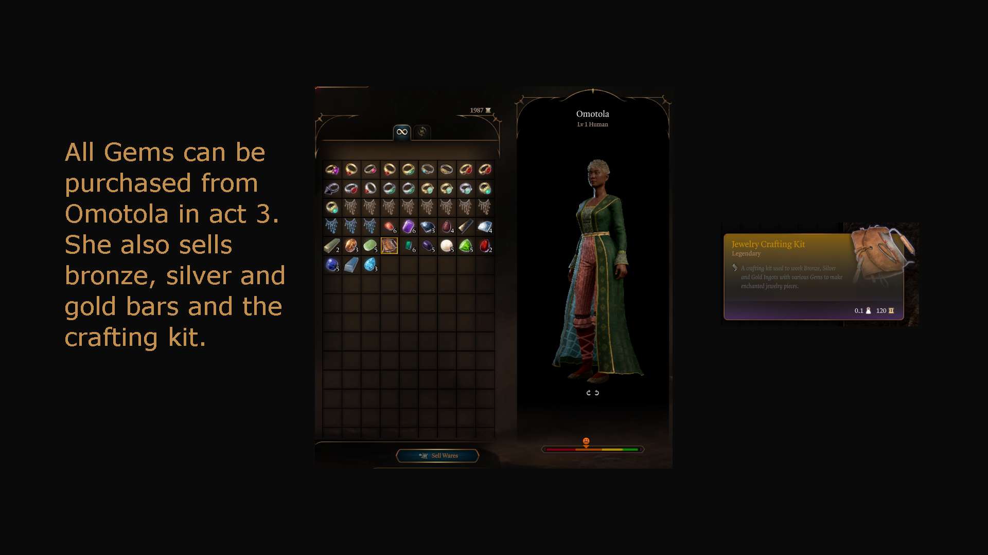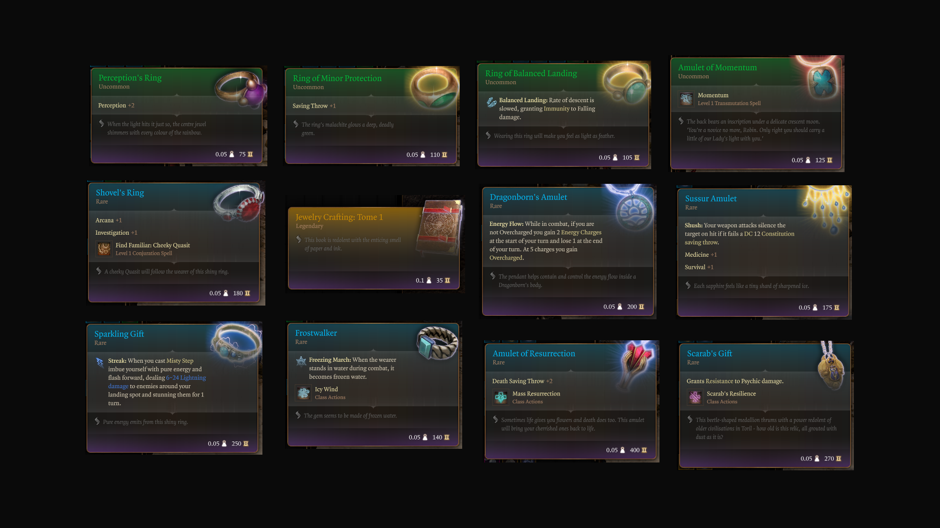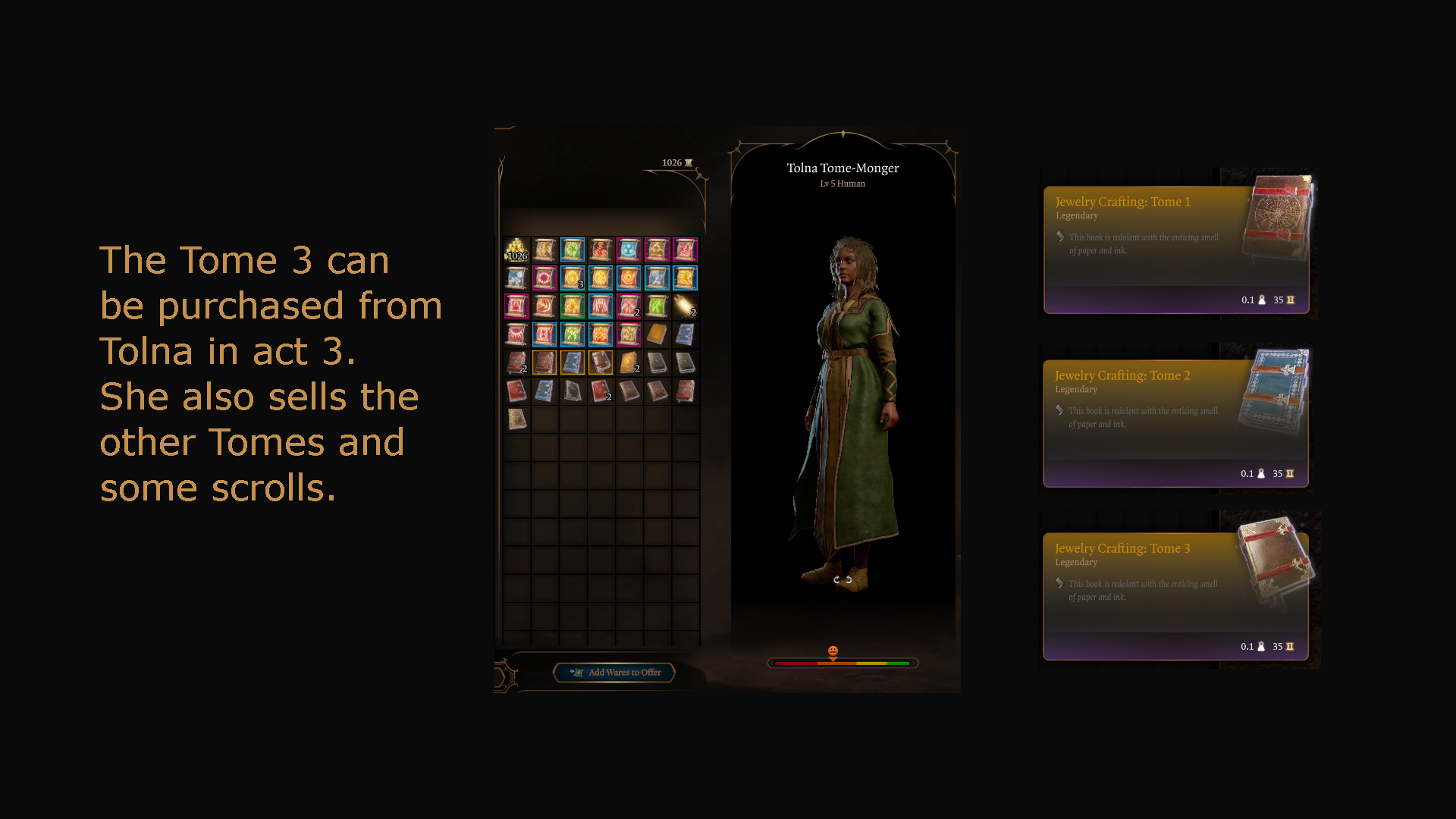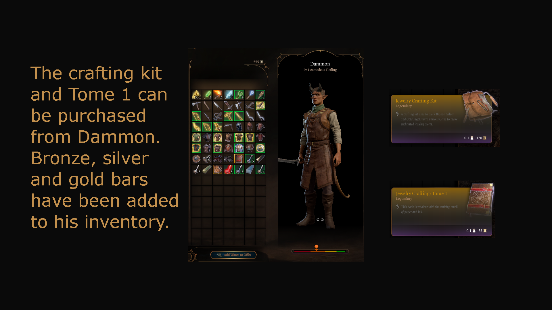 你可以从 Dammon 处购买珠宝制作工具包和《珠宝制作:卷一》书籍来开始你的旅程。随着你在战役中的进展,你会获得其他书籍以学习新的配方。