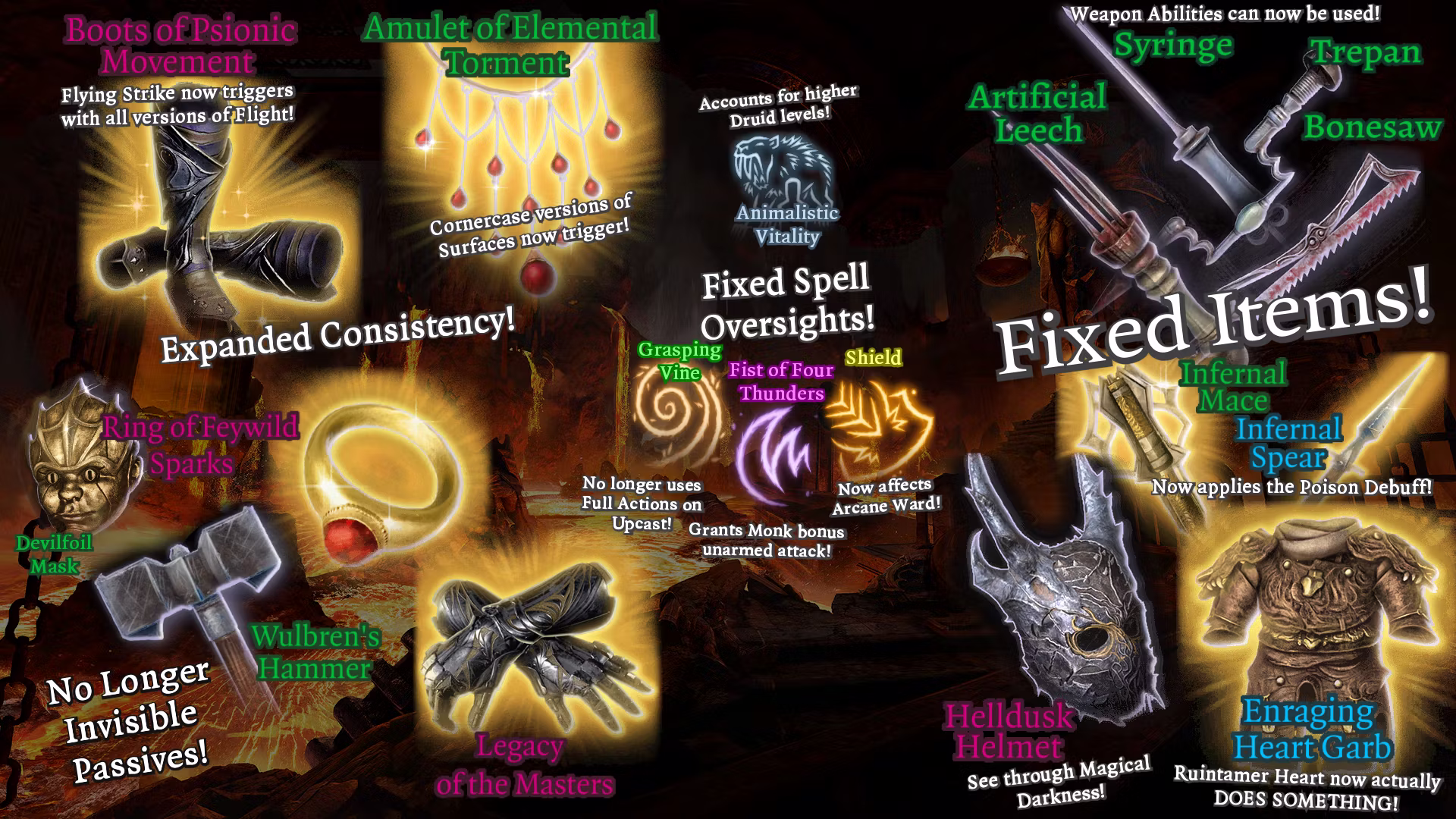 - 元素折磨之戒现在检查更多合理的表面,如冰、其他毒物和火焰变体以及困难地形,并根据情况应用效果。