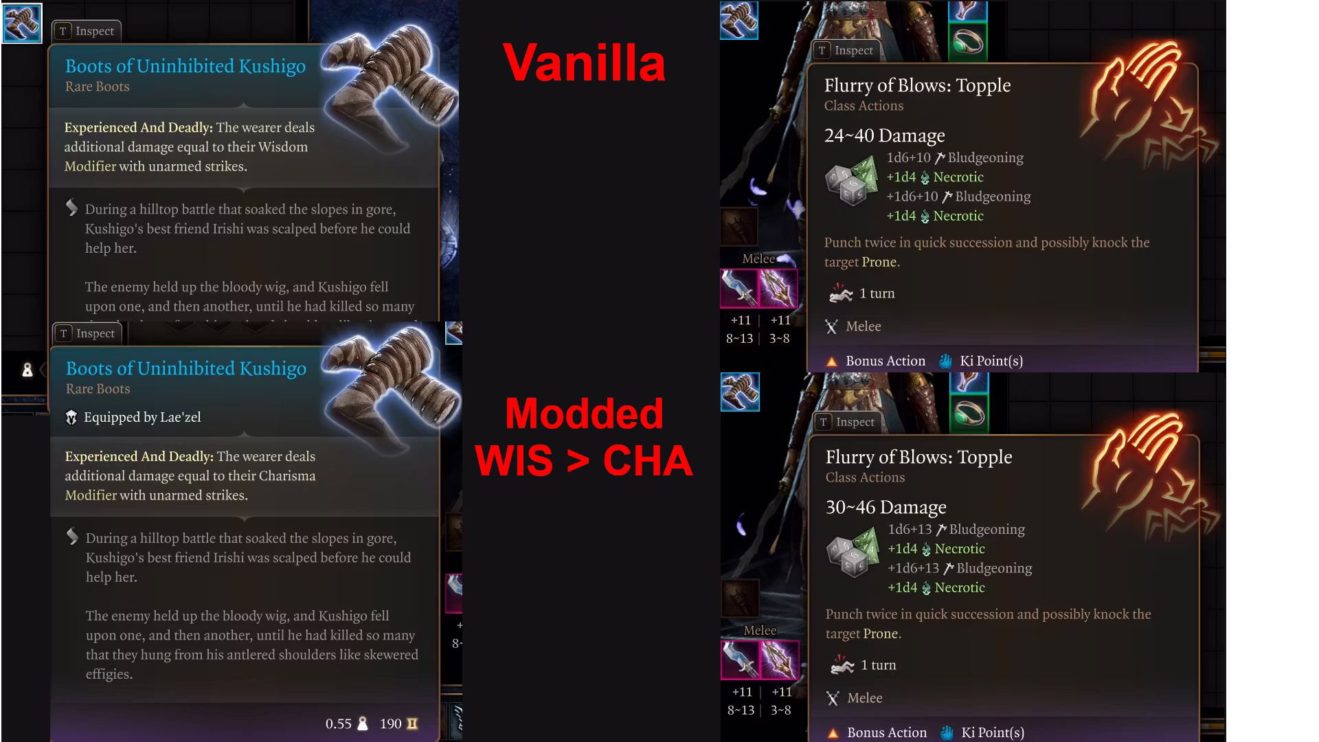 作为一名魅力僧侣,我发现Kushigo无拘束靴仍然使用智慧属性来增加徒手攻击的伤害。此模组将其改为使用魅力属性,对于希望用靴子踢人并使用魅力属性的职业非常有用。