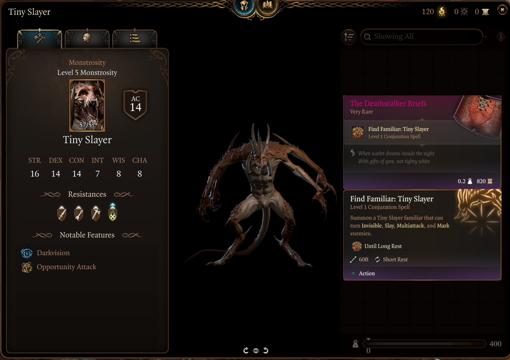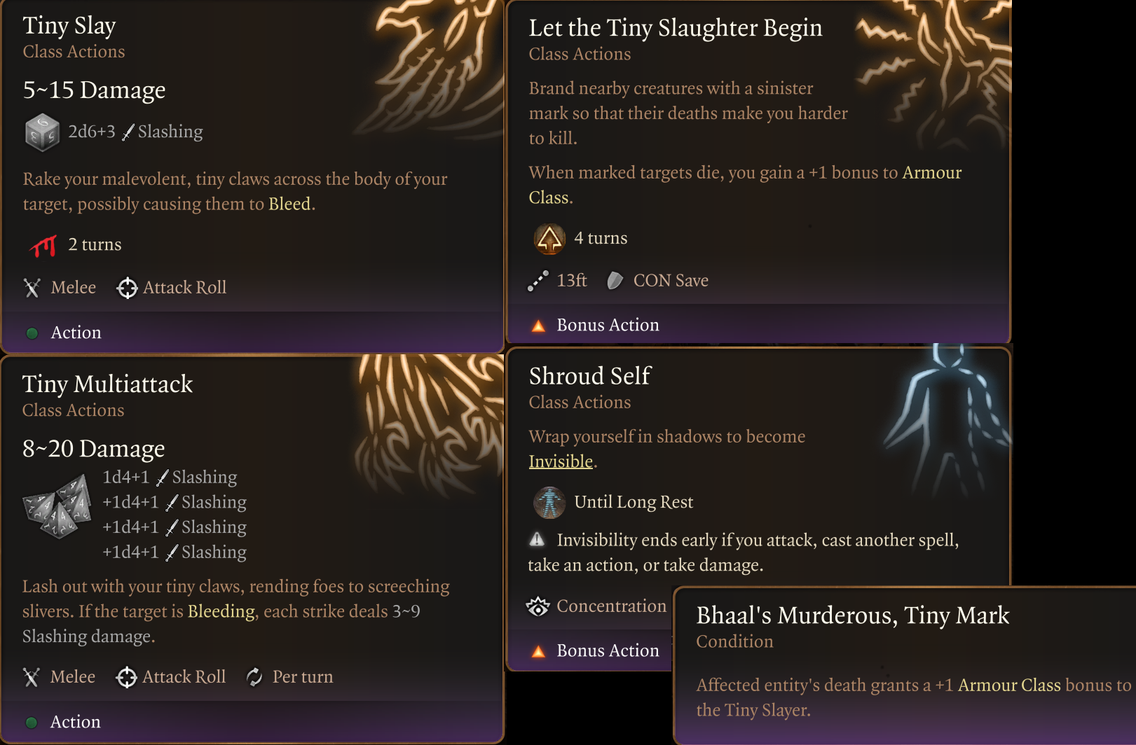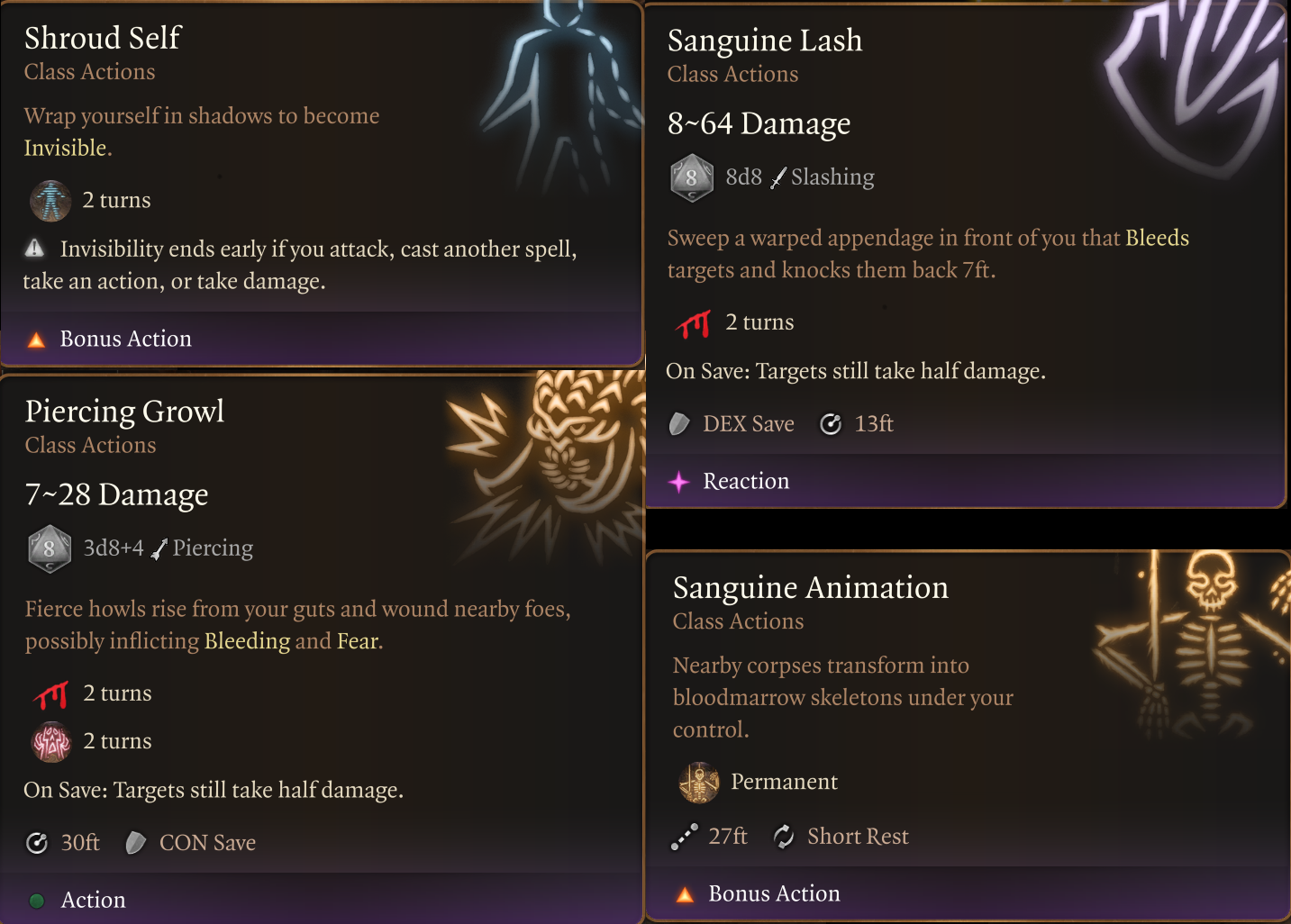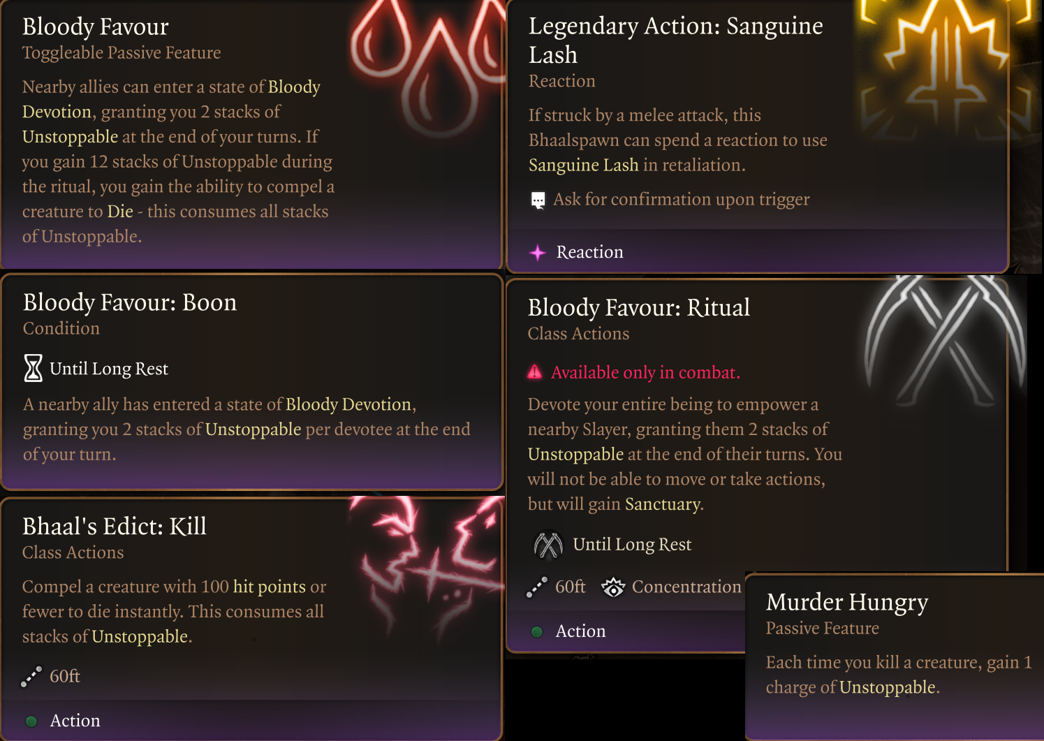 当这个被动技能激活时,附近的盟友将获得一个新的动作,“血腥恩惠:仪式”。你的盟友可以选择使用此动作来牺牲自己的回合以增强 Slayer。对于每个参与仪式的成员,在 Slayer 的回合结束时,Slayer 将获得 2 层不可阻挡效果。集中中的仪式参与者无法移动或采取行动,但会获得圣域。