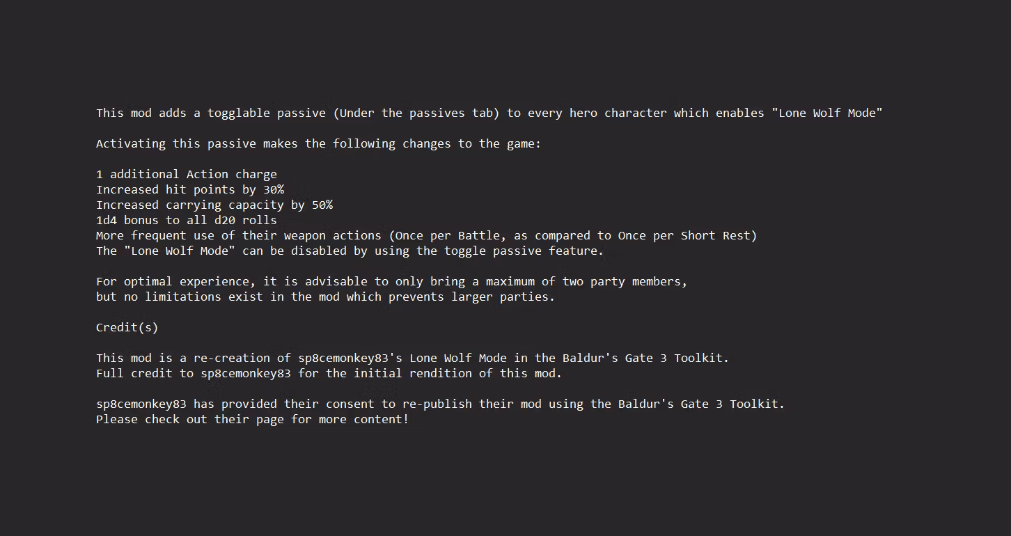 此模组为每个英雄角色添加了一个被动技能(在被动技能标签页中),启用“孤狼模式”。