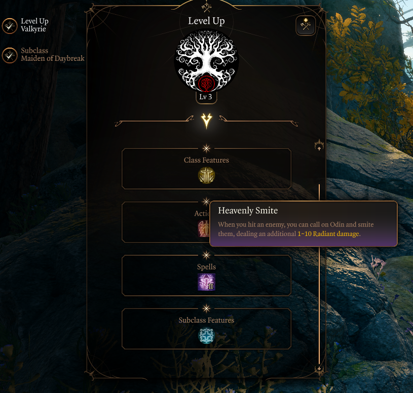 (瓦尔哈拉)奥丁审判,英灵殿:在自己周围创造一个区域来模拟瓦尔哈拉的力量以增强盟友,并赋予+2攻击掷骰加成、额外的攻击伤害以及立即成为英灵的能力。