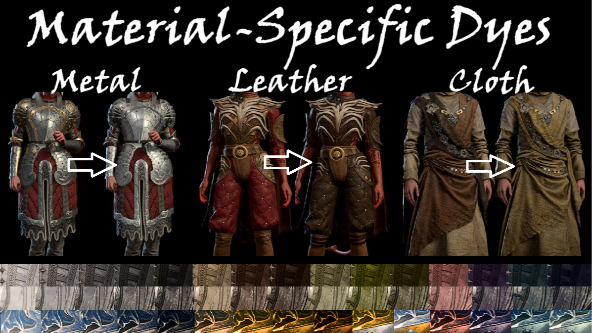 重要提示: 在一件护甲上混合多种染料(先应用一种染料,然后更改另一种材料)可能会导致重新装备时颜色重置为最后应用的染料与护甲基础颜色相结合的颜色。此模组最适合微调护甲原始配色方案。为了获得最佳效果,请每件护甲只使用一种特定材质的染料以达到你想要的效果。