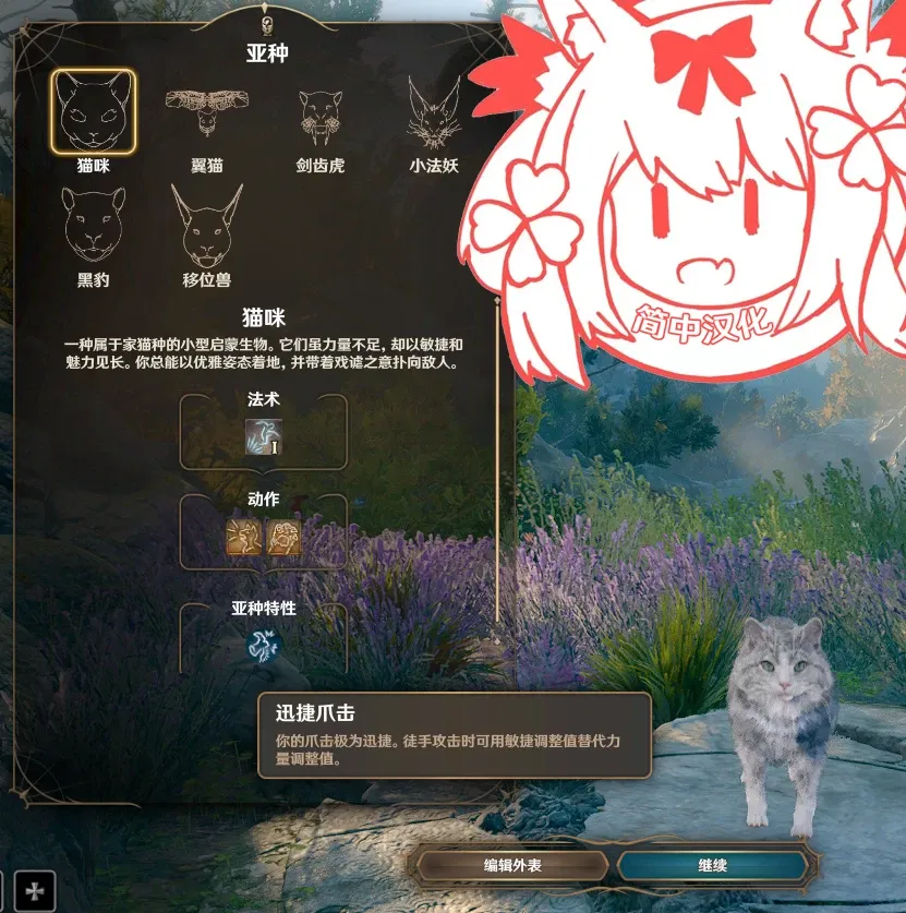 Mirri 的可游玩猫科和豹猫人福瑞种族的中文翻译。添加了猫、翼猫、剑齿虎、小法妖、黑豹、移位兽和豹猫人作为可选初始种族。猫科的可自定义外观选项比较少,豹猫人就多一点。每个子类型都有独特技能。