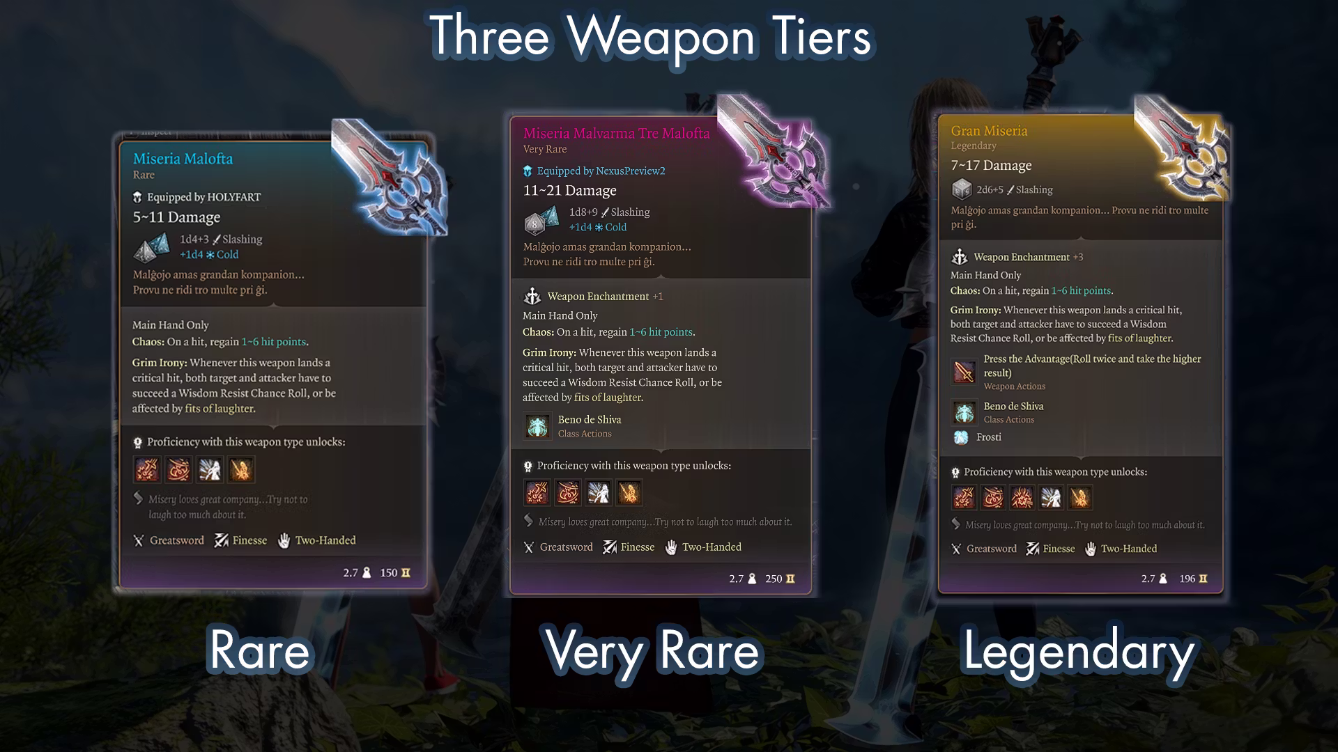 武器属性在画廊中已过时!非常抱歉!更改:移除“Grim Irony”,替换为“Glee 的光辉” – 力量基础豁免,击中要害时生效,以符合补丁8的要求。