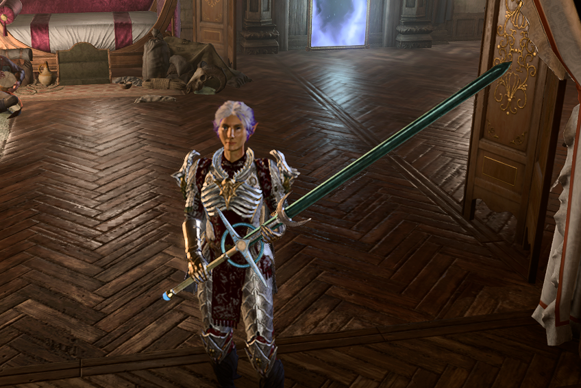 该模组中有两种版本的月刃:一种是专门为艾琳女士设计的淡蓝色带有金色装饰和金缮工艺的刀刃;另一种则是更接近《冰风谷II》中玩家使用之剑的绿蓝色变体,带有银色装饰。玩家版可以在第三幕公会大厅由 Sticky Dondo 出售。如果您查看他的商店并发现无法购买该剑,请尝试通过长时间休息刷新其库存。