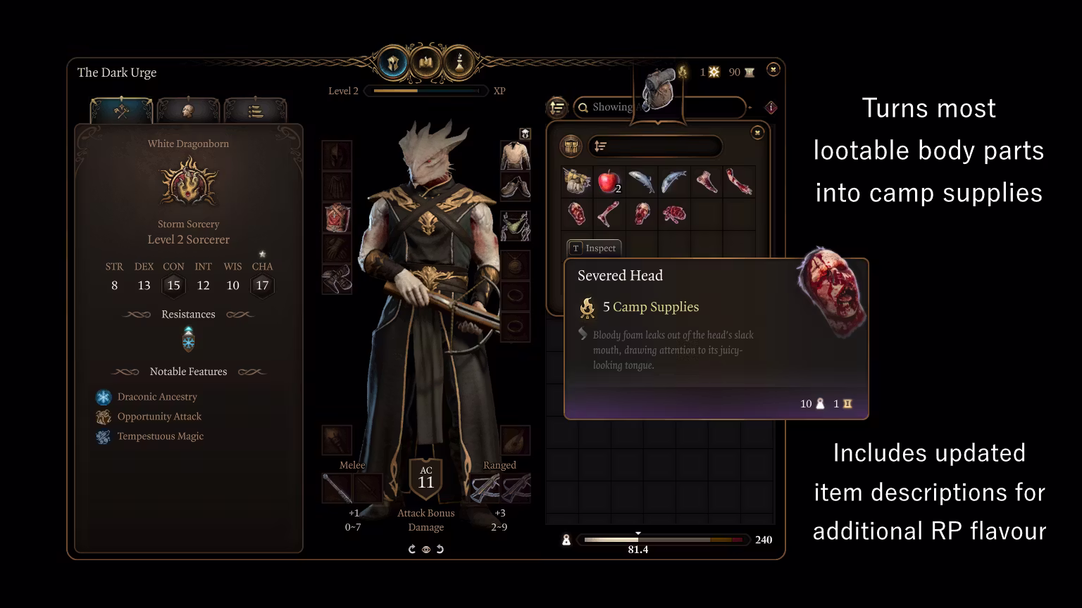 此模组将游戏中大多数可拾取的身体部位转换为营地补给,以增加黑暗欲望角色(或类似倾向的塔夫)的角色扮演风味。