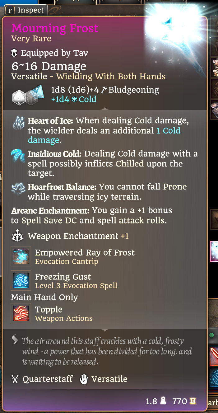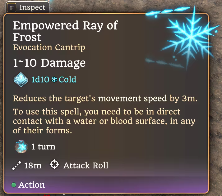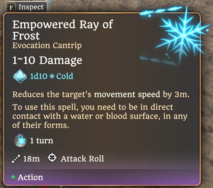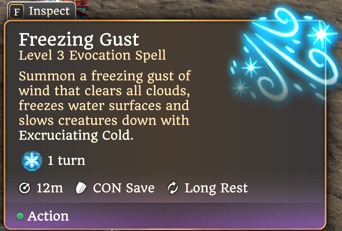 - 新独特群体控制法术“寒风”(Freezing Gust),可每长休息使用一次。详情请参见截图,主要效果是提供一种其他冷/冰系法术无法实现的独特功能,以补充你的游戏风格。该法术施加的新状态“极度寒冷”与“缓慢”法术的减速状态基本相同,但仅持续1回合(直到施法者的下一个回合开始),且需要进行体质豁免。