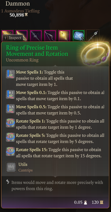 - 整理开关(ON/OFF)- 防止/允许目标物品被整理。解释:《博德之门3》有一个机制,在玩家离开某个营地或前往另一个地区时,会将大多数放置在地上的物品移动到旅行者箱子中。例如,从下城前往巨龙十字路口时,整理机制会被激活,并且所有放在精灵歌酒馆中的物品都会被移至旅行者箱子。