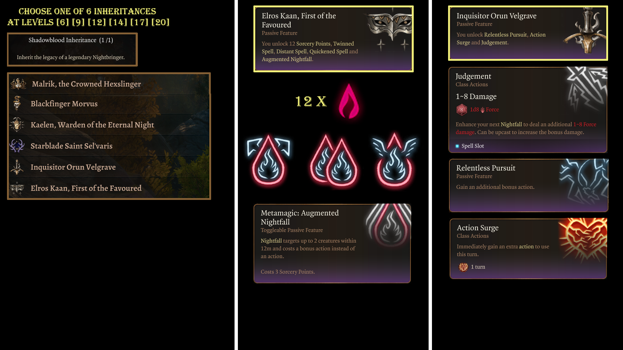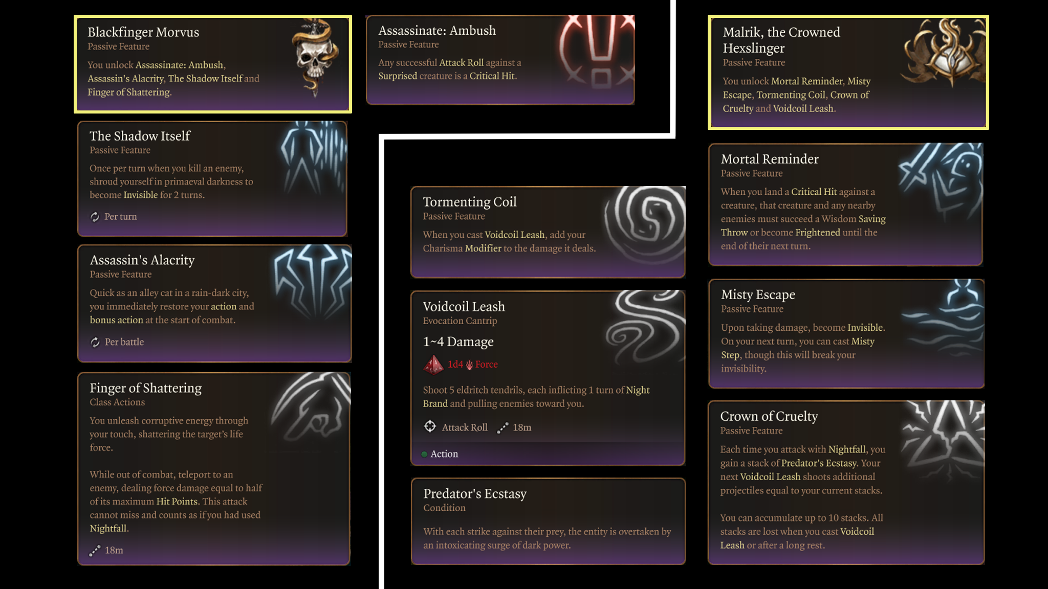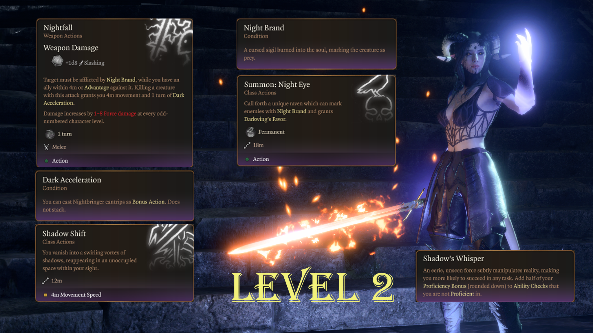 夜行者的主要特点是感觉:一个充满边缘感、疏离感和掌控力的职业,主题是阴影与黑暗。我专注于背景故事和视觉效果,以提供沉浸式体验。这种职业风格也支持这一核心幻想。