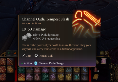 誓言通道:风暴斩击:正常武器伤害 + 1d6 + 等级加值 + 法术能力修正。每到奇数等级时,额外造成 1d6 的伤害。