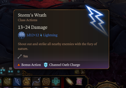 誓言通道:风暴之怒:所有在9米范围内的敌人受到 (1d12+ 圣骑士等级 + 魅力修正) 的闪电伤害。闪电从天空中劈向它们。