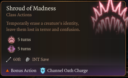 在1级时,你将获得“宣誓通道”能力。当你使用这个能力时,你可以对一个敌人造成心灵伤害,并且该敌人的所有盟友都会受到恐惧效果。
