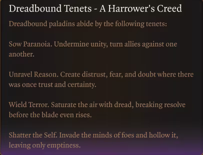 在恐惧中锻造并经受心理战考验,恐惧誓言圣武士是一个无情的力量,他们以同样残忍的方式粉碎敌人的意志和肉体。他们不被神圣力量所束缚,而是遵循《堕落升天典籍》的指引。他们的存在侵蚀感官,将朋友变成敌人,并使坚定的决心化为退缩。他们的目标不是激励他人,而是制造恐惧。这些圣武士被称为“堕落者”,那些追随这条道路的人并不寻求和平,而是追求控制。遵守恐惧誓言就是尊崇恐怖和畏惧作为神圣教义,使用恐惧作为征服的武器,并像瘟疫一样释放扭曲。