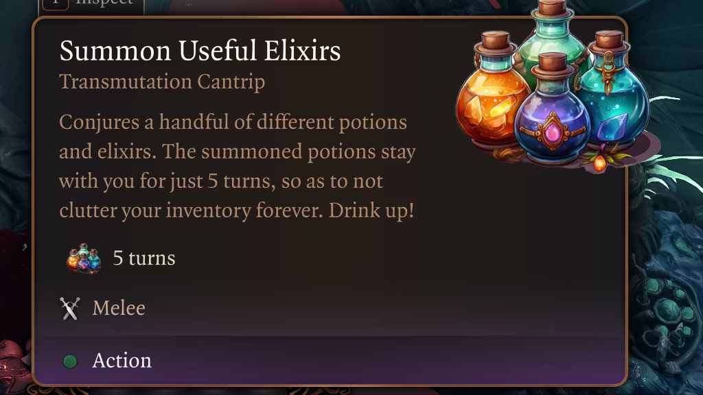 自1.0.0.7版本起,此模组还包括一瓶学习药剂(添加为营地宝箱的一次性奖励)。这允许任何玩家学会召唤有用物品的法术(这也是基础卷轴上的法术)。学会该法术后可以解锁多目标施放能力(一次性将灵药放入队伍所有四名成员的物品栏中)。由于游戏UI无法处理直接从卷轴激活的多目标容器法术,因此学习此法术是必要的。