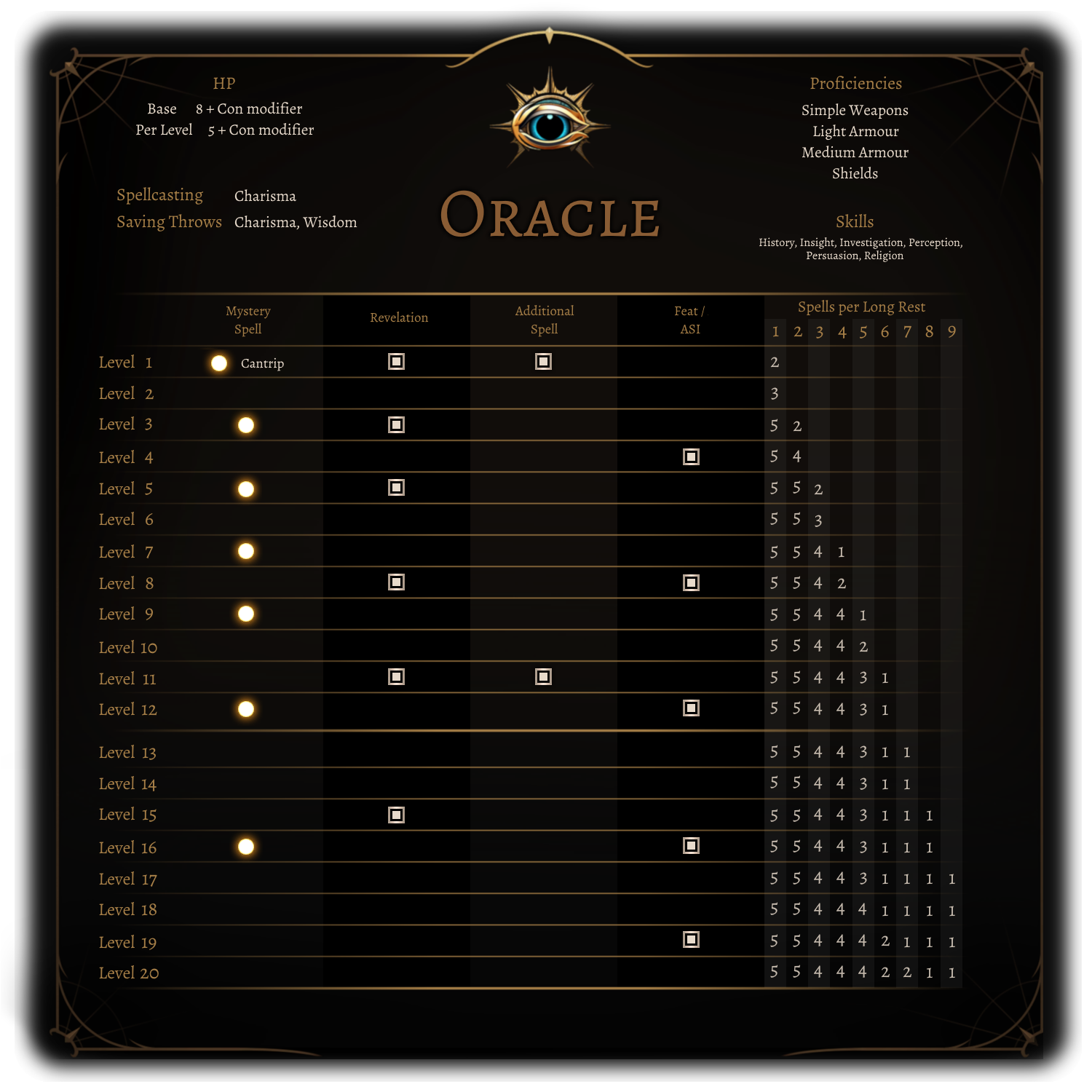 从机制上讲,这个职业可以总结为“先知相对于牧师就像术士之于法师”。先知是基于魅力的施法者,不需要每天准备法术,但他们的可施展法术范围更有限,因为他们是在升级时选择法术而不是像牧师那样获得整个法术书。他们失去了牧师的引导神力特性,并且先知会根据自己的研究方向选择一个“神秘”(在这里作为子职业),以期揭示力量来源的知识并增强它们。