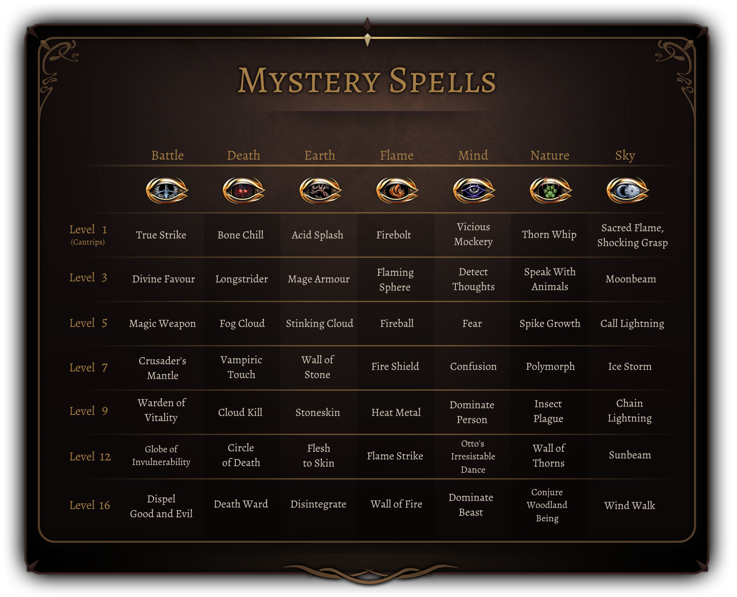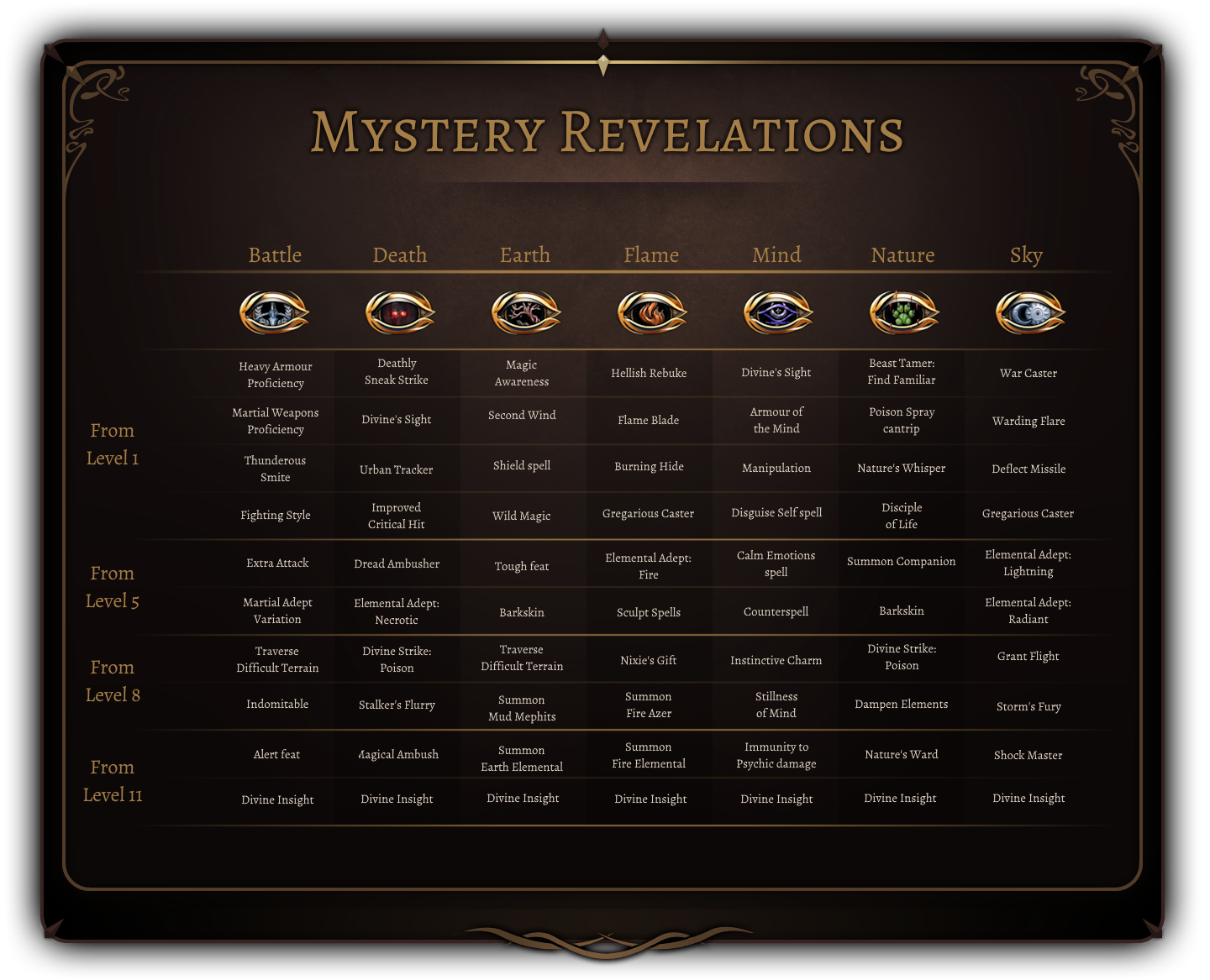 此模组中的神秘内容与《龙与地下城》中所表示的内容有很大不同,因为我想将其呈现为一系列通过角色进展做出的多样化且具有影响力的抉择,并且由于《博德之门3》自然限制在12级以内(该模组支持至20级,尽管后期等级的发展较少),因此提前加载了一些启示。神秘内容会定期让你选择各种增益、技能和专长,但你无法在达到最高等级时选择所有选项。某些神秘内容提供了其他情况下需要多职业才能获得的游戏风格——例如战斗有许多战士的特性,而自然则提供野蛮人游侠的动物伙伴——但是这些内容更为有限,因此你不能完全实现专业化职业的全部潜力。