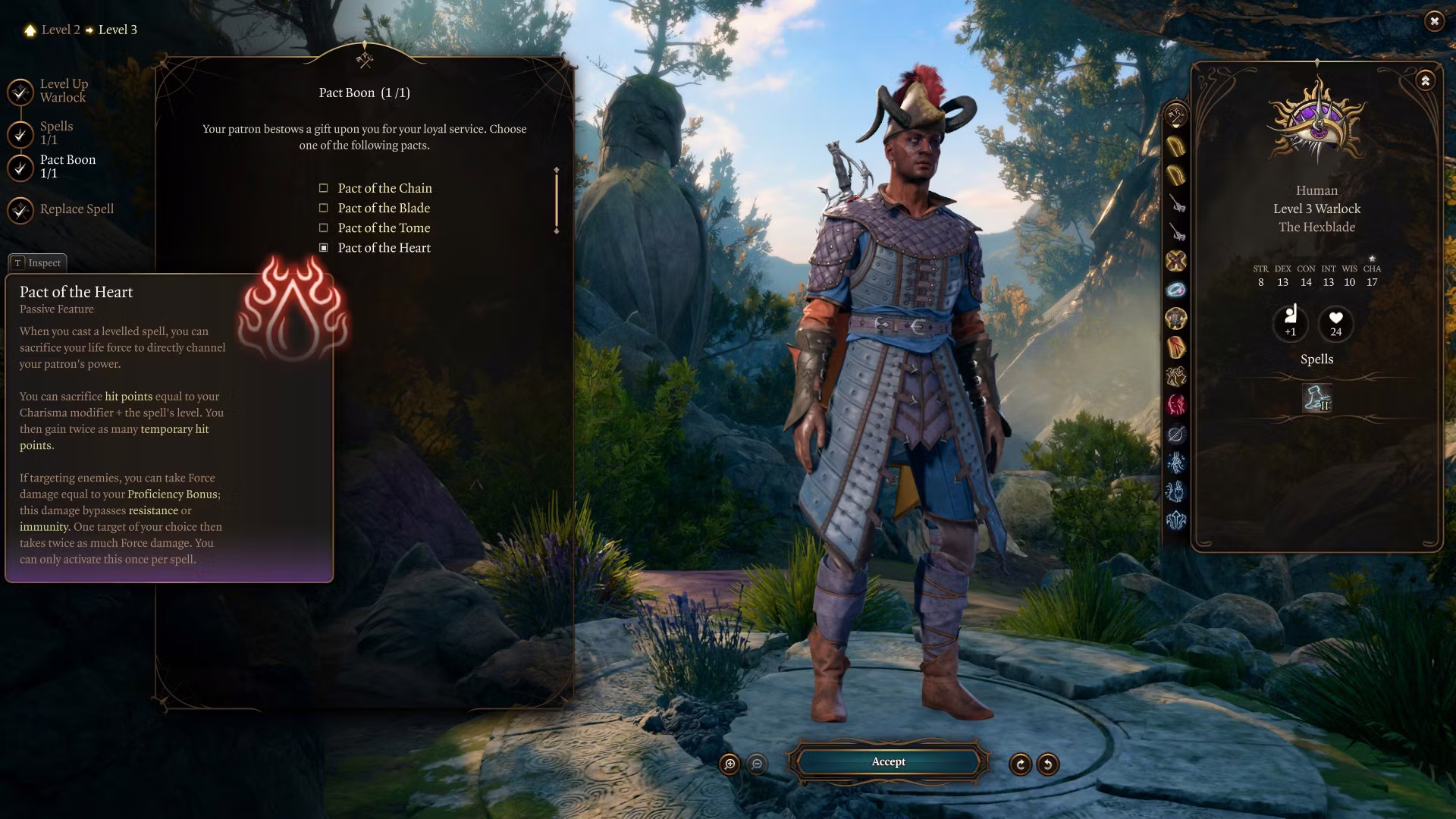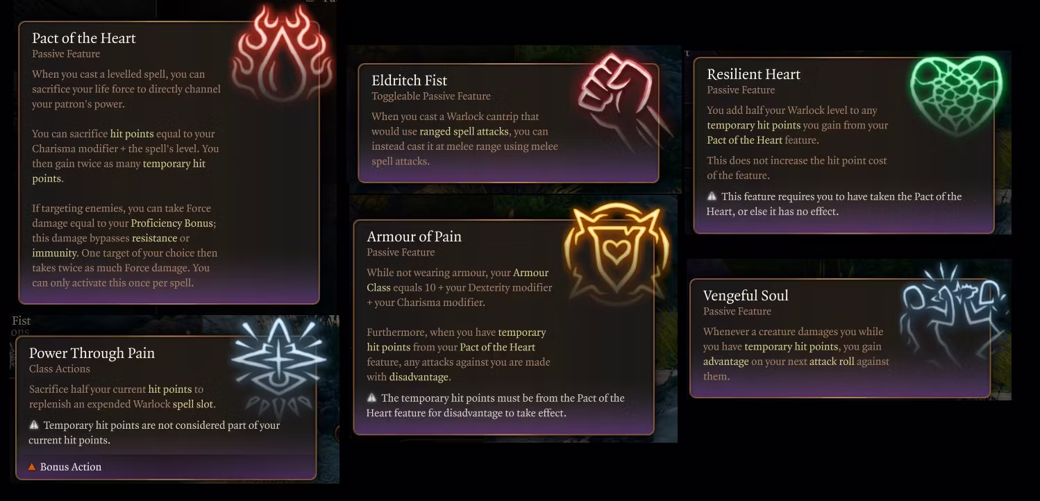 我无法设置功能先决条件,因此你实际上可以在任何誓约中选择依赖心灵之约临时生命值的召唤。当然,这对你来说毫无用处,所以通常这不是最佳玩法。我已经在所有依赖早期誓约特性的召唤上添加了小提示警告。由于大多数特定誓约的召唤要么被泛化或合并到誓约本身中,我遵循了一定程度的做法,使“炽热火焰”召唤默认获得。 (我在具体要将哪些特性烘焙进誓约的问题上反复考虑过。)