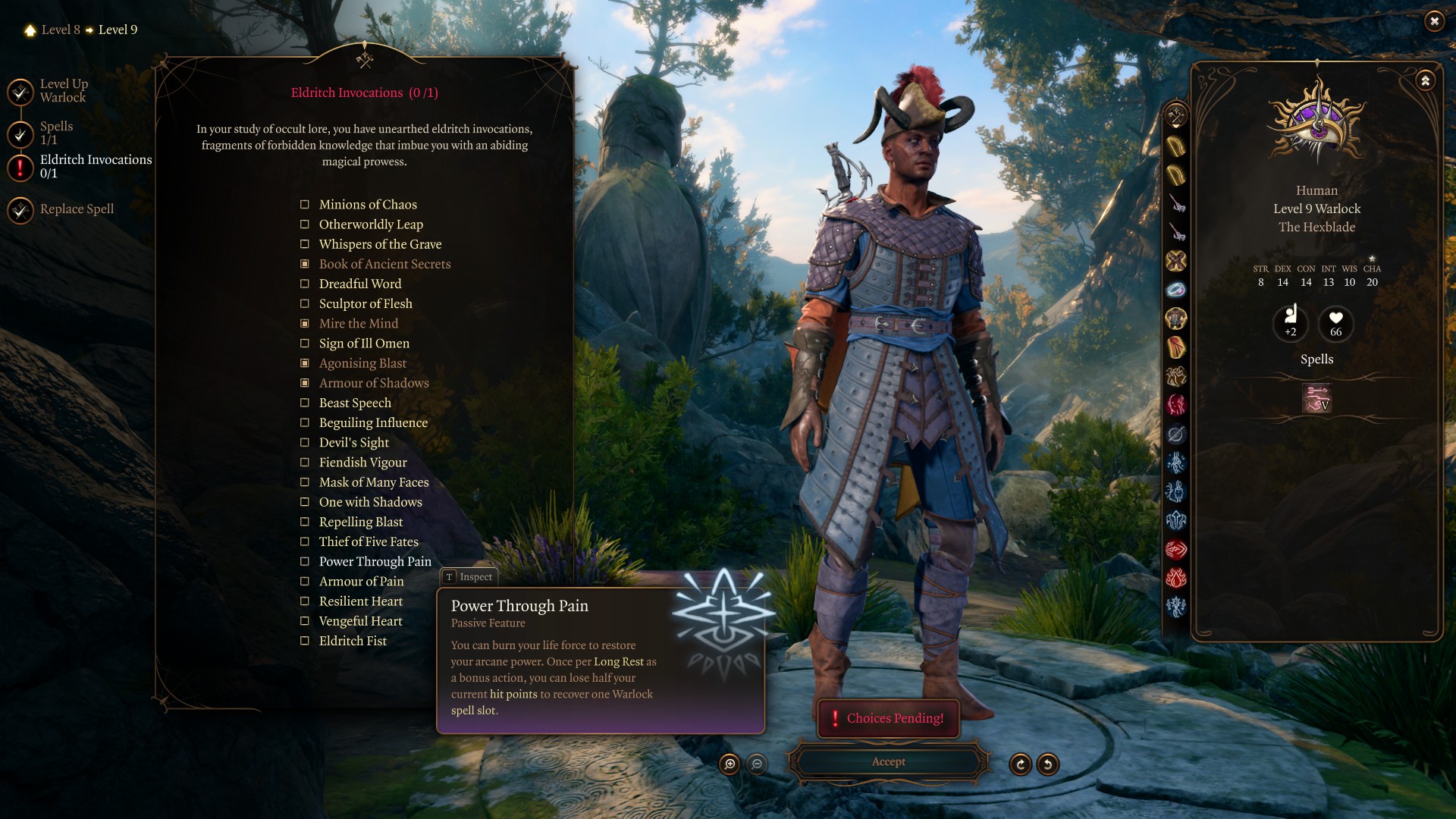 我无法设置功能先决条件,因此你实际上可以在任何誓约中选择依赖心灵之约临时生命值的召唤。当然,这对你来说毫无用处,所以通常这不是最佳玩法。我已经在所有依赖早期誓约特性的召唤上添加了小提示警告。由于大多数特定誓约的召唤要么被泛化或合并到誓约本身中,我遵循了一定程度的做法,使“炽热火焰”召唤默认获得。 (我在具体要将哪些特性烘焙进誓约的问题上反复考虑过。)