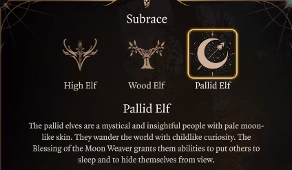 添加了来自《龙与地下城》5e(2020年)野境探索者指南:威德蒙特源书中的苍白精灵作为精灵的子种族。还有一种半精灵版本,拥有相同的种族特性。