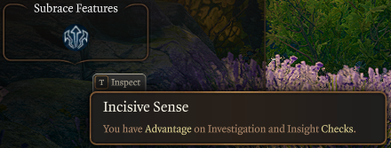 敏锐感知被动技能。你在调查和洞察检定中具有优势。