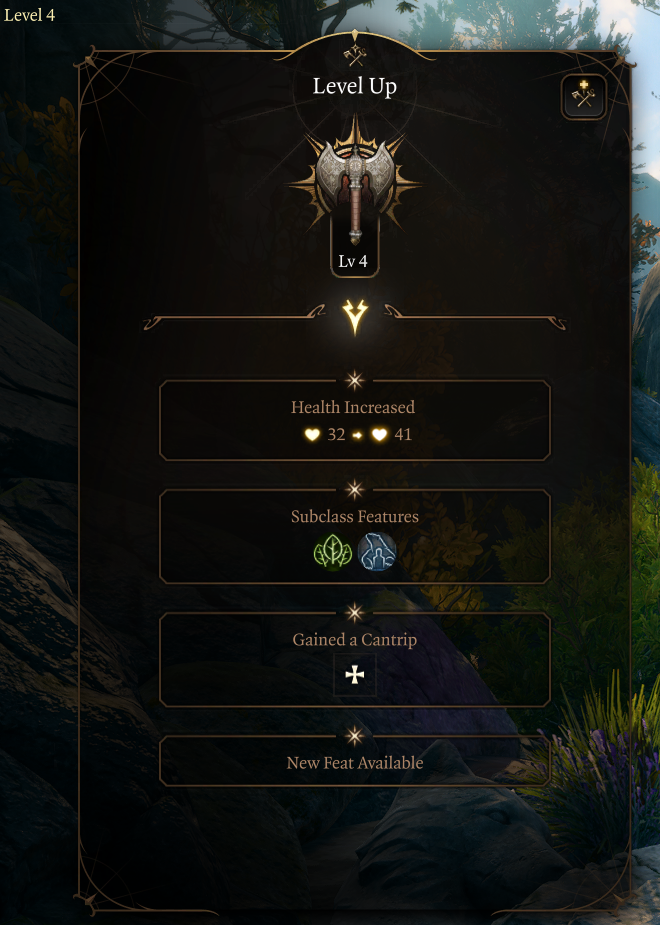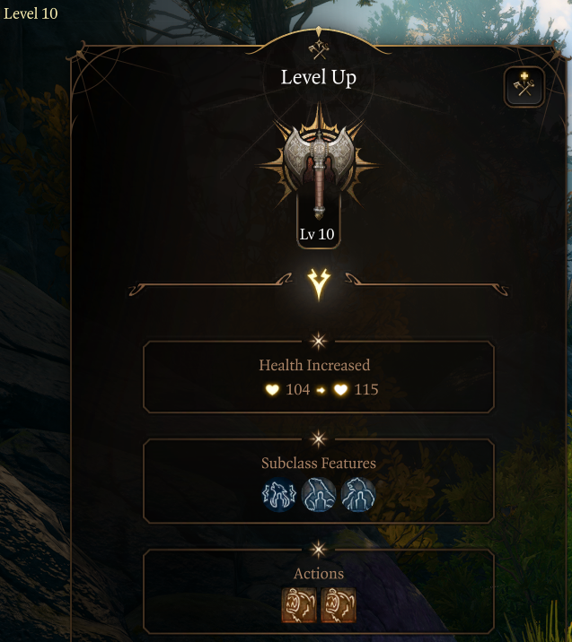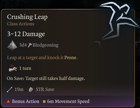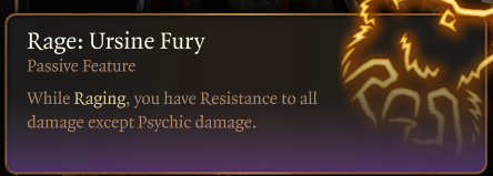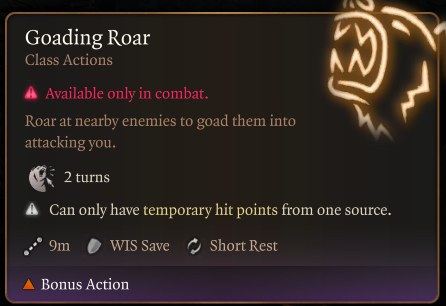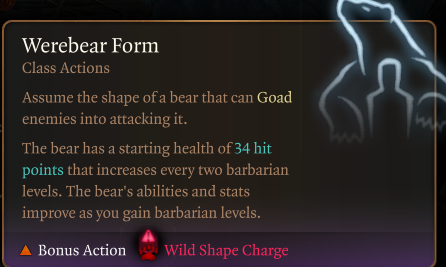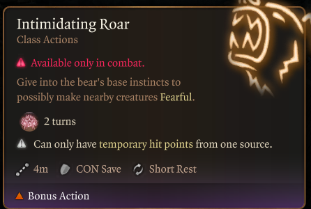 屈服于熊的原始狂暴,使你的力量和体质在四回合内各增加 2 点,并获得 20 点临时生命值。到第 18 级时,力量和体质各增加 4 点,且你将获得 30 点临时生命值。