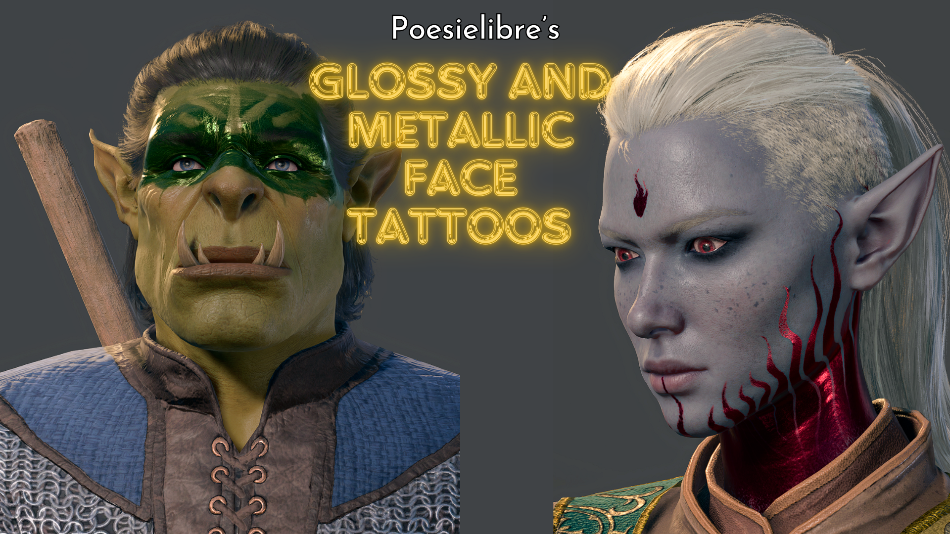 此模组将所有可用的 44 种脸部纹身选项改为光泽和金属质感,这会影响所有玩家的纹身。额外的颜色与此模组兼容,请一次只选择并使用一个文件!