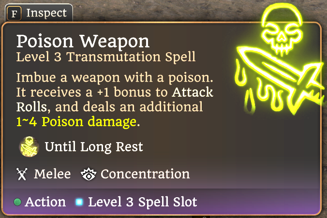 添加了一个新的法术:中毒武器。功能完全类似于元素武器法术,但使用毒药:攻击掷骰+1和+1d4毒伤害。可以升级施放。与20级模组兼容。该法术被添加到德鲁伊(5级)、游侠(9级)和誓言破坏者(9级)中。
