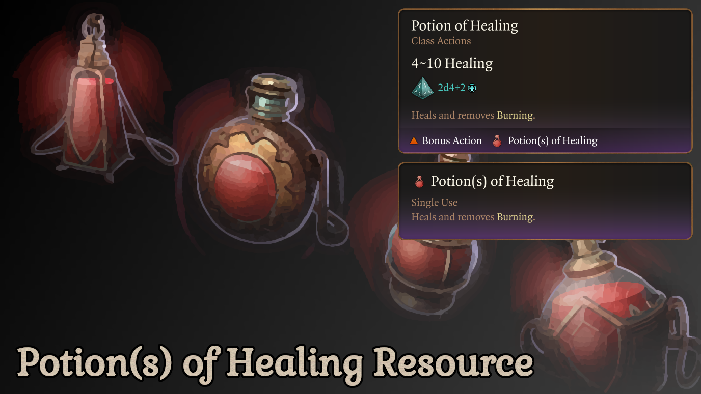 治疗药剂的管理可能会有些繁琐,特别是在单人游戏时需要同时处理4个同伴的背包。此模组旨在通过将你拾取的所有治疗药剂转换为新的“治疗资源”来减少这种乏味感。“治疗资源”可以在所有同伴之间共享(包括法师之手!),并且各种类型的治疗药剂会随着你的等级提升逐步解锁。这些解锁功能即使你在多职业的情况下也应正常工作,更好的治疗药剂将提供更多的资源。