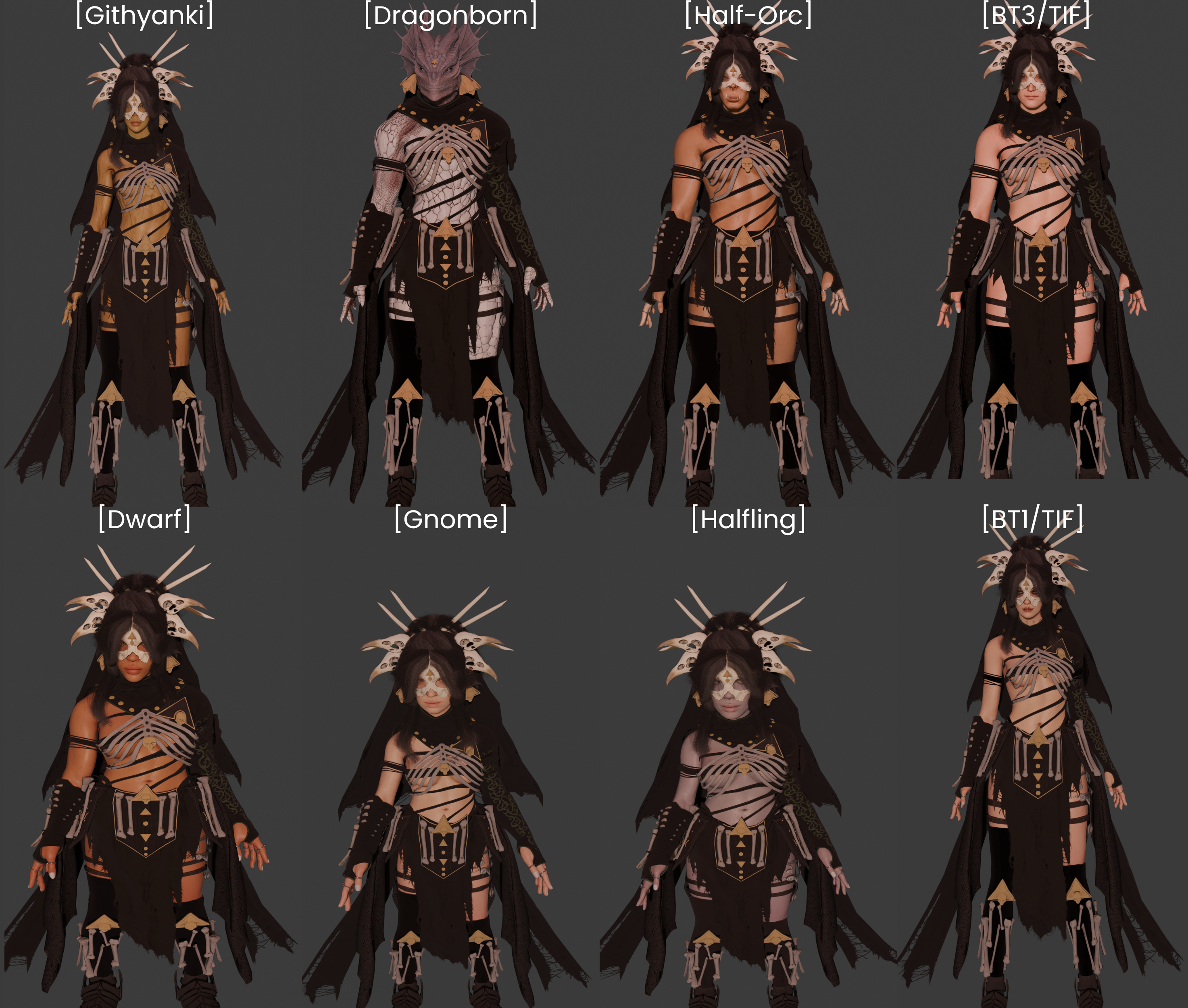 此套装是为我新开始的一个项目收藏的一部分。这个收藏不仅要在种族和体型之间广泛兼容,还要成为一个庞大且丰富的神灵启发式收藏,以激发在 BG3 内外创造新的角色和故事的新想法。