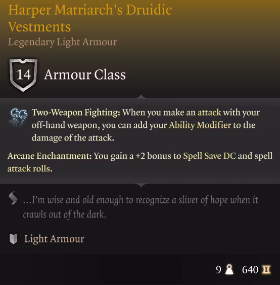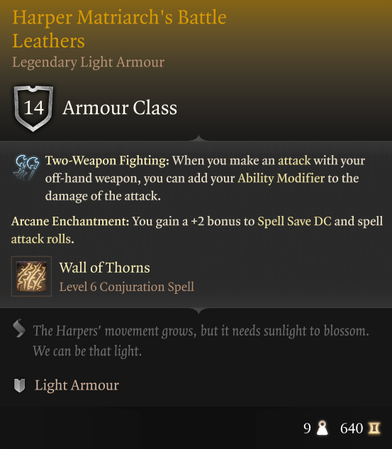 为贾海拉和敏斯克打造的传奇终局装备。对于贾海拉,我制作了两种变体,它们应该具有相同的属性。一种看起来像她的初始护甲,可以从恩萨尔·丹瑟隆那里购买;另一种看起来像《陆地之铠》可以在魔法杂货店购买。敏斯克的护甲可以从小偷公会大厅里的孩子那里购买。敏斯克的护甲增强了他的狂怒能力,并且肯定比我的其他物品更强大,但灵感来自于第二版扩展书《被施法束缚》中的拉什马尔狂战士。