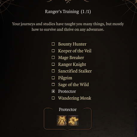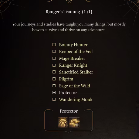- 使用磨练过的游侠本能,从一个非常有限的法术列表中施放法术