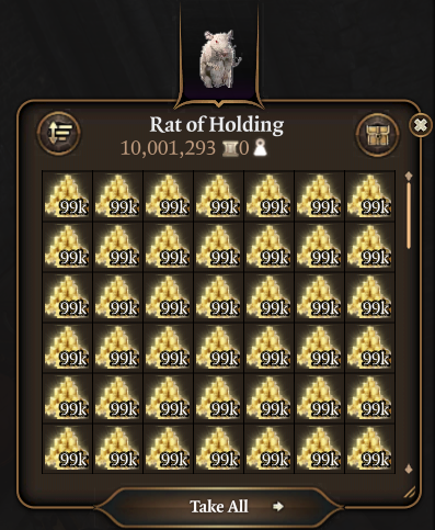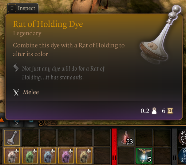你现在可以购买传奇染料来改变你的储物鼠™的颜色了!这种染料由现有的授权储物鼠™商人出售。染料的功能与其他具有多变魔法的物品/卷轴一样,所以请确保将其添加到快捷栏或设置一个键绑定以使用它。你可以选择默认颜色或者绿色、蓝色、品红色和金色。这对于有组织感的冒险家非常有用。