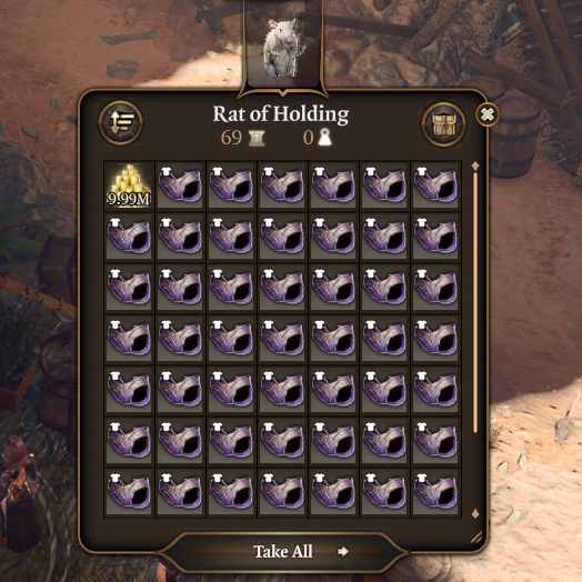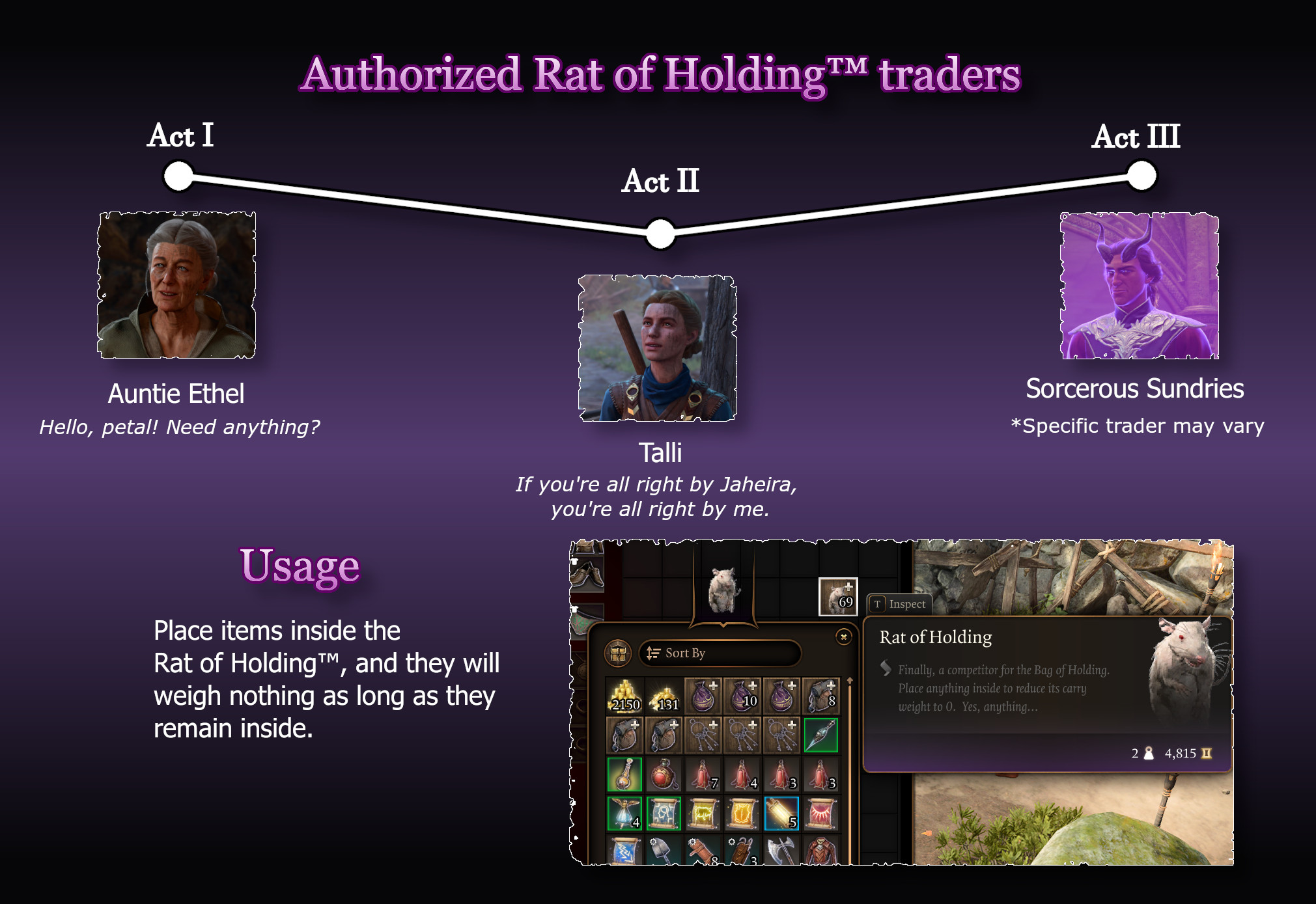 这款储物鼠™由最优质的魔法注入的老鼠制成,这些老鼠是由最执着的赤脚游侠收集来的。它的工作原理与古老的、俗气的储物袋完全一样,这是你的塔夫一直在恳求的东西。