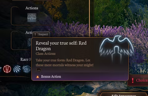 你的基础速度为15,1个动作和2个额外动作,未穿护甲时的AC值为19。基本种族法术:飞行、龙息、变身为红龙。