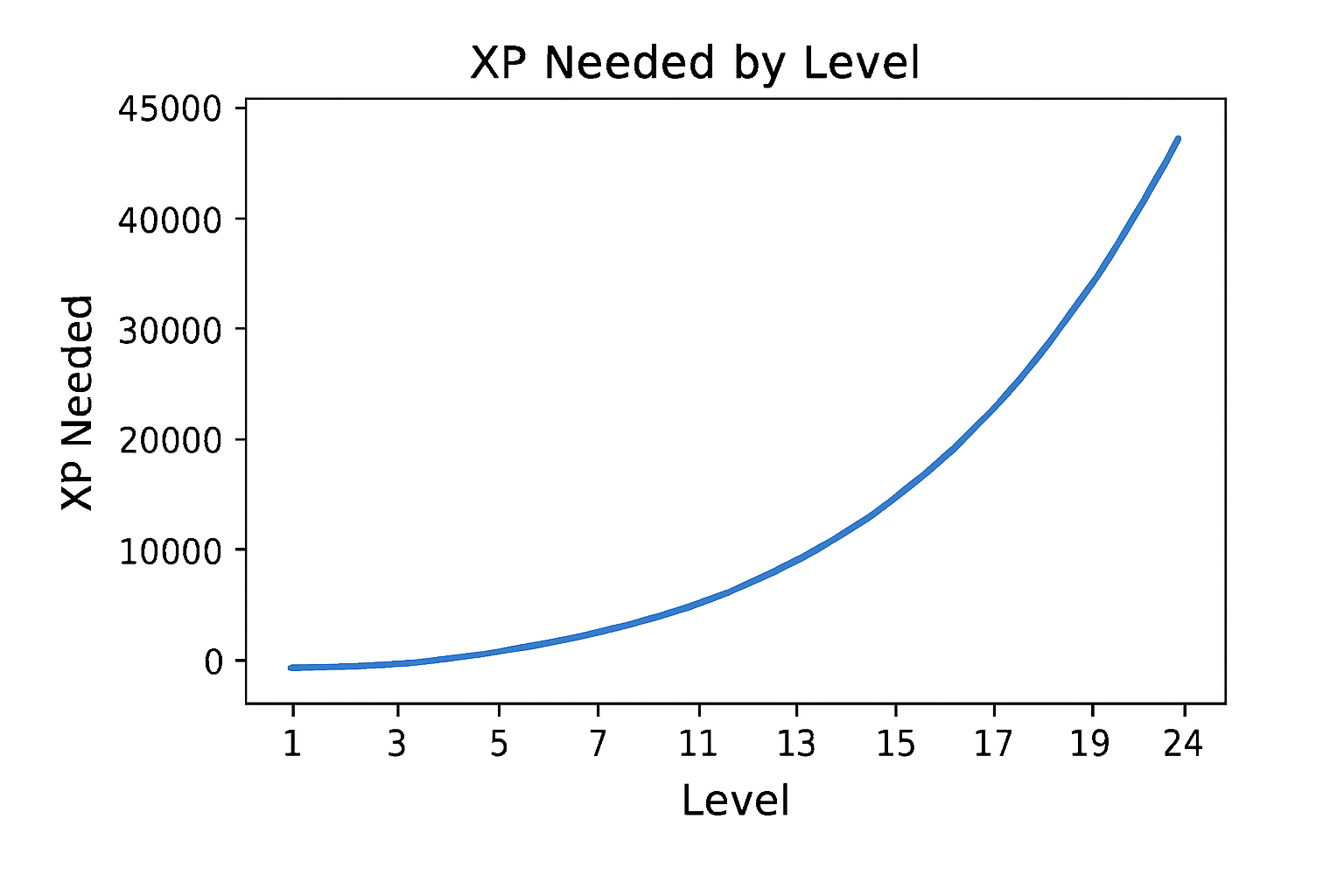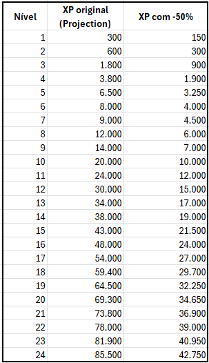 From this, a projection of experience gain up to level 24 was made and reduced by 50%.