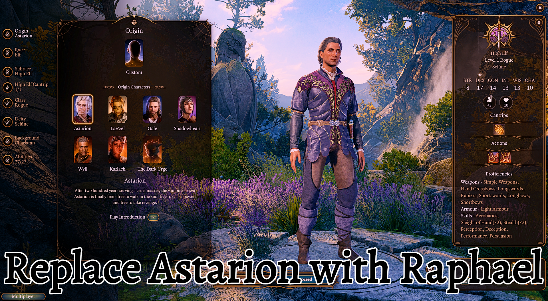 有人要求我制作一个拉斐尔起源角色替代模组,供那些希望在游戏中扮演拉斐尔作为同伴的玩家使用。因此,我做了两个版本:这个和用加莱替换拉斐尔。你可以下载其中一个或同时下载。